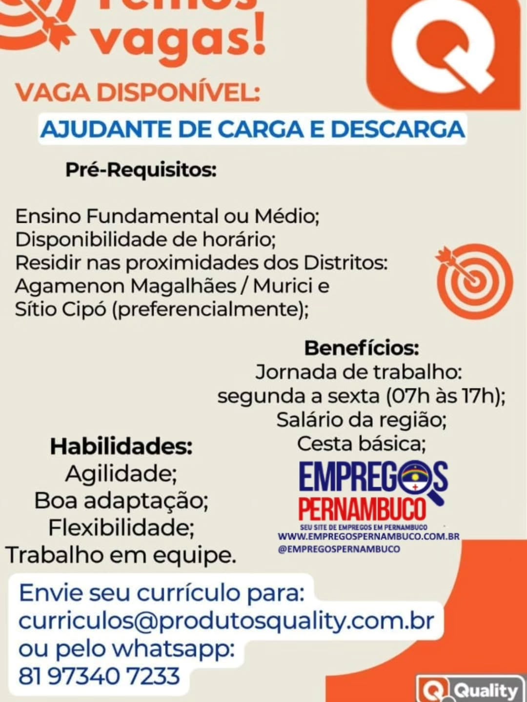 1 Vaga de emprego para Ajudante De Carga E Descarga em Produtos Quality / Empregos Pernambuco nesta segunda-feira (30/03)