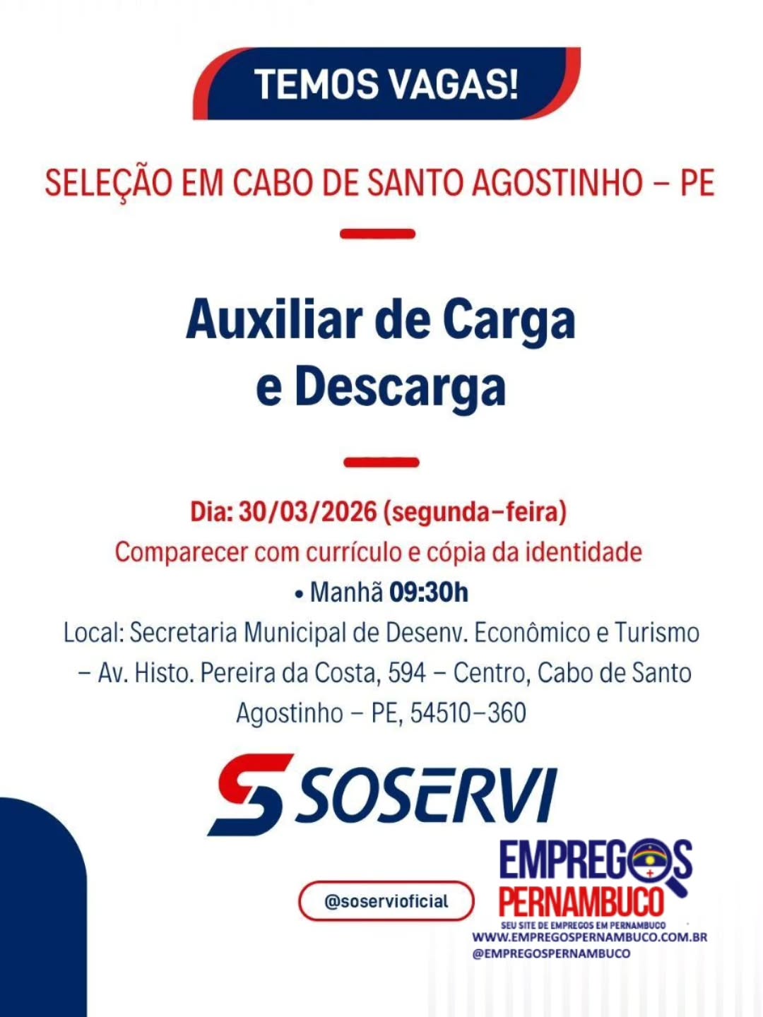 1 Vaga de emprego para Ajudante De Carga E Descarga em Soservi nesta terça-feira (31/03)