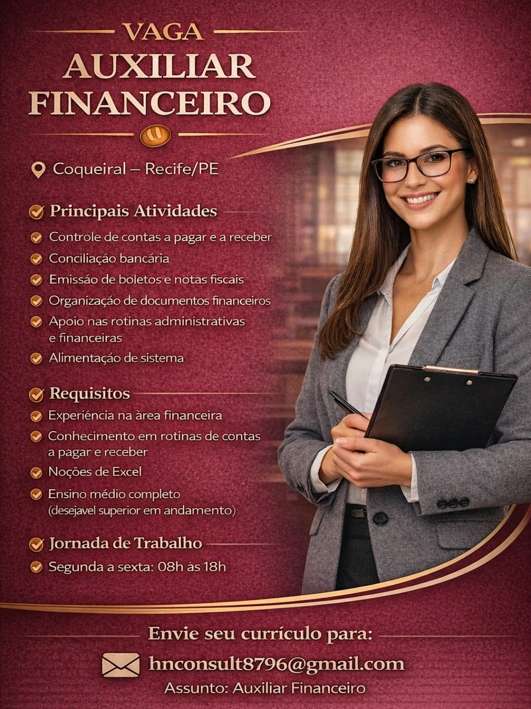 1 Vaga de emprego para Assistente Financeiro em Pernambuco nesta segunda-feira (30/03)