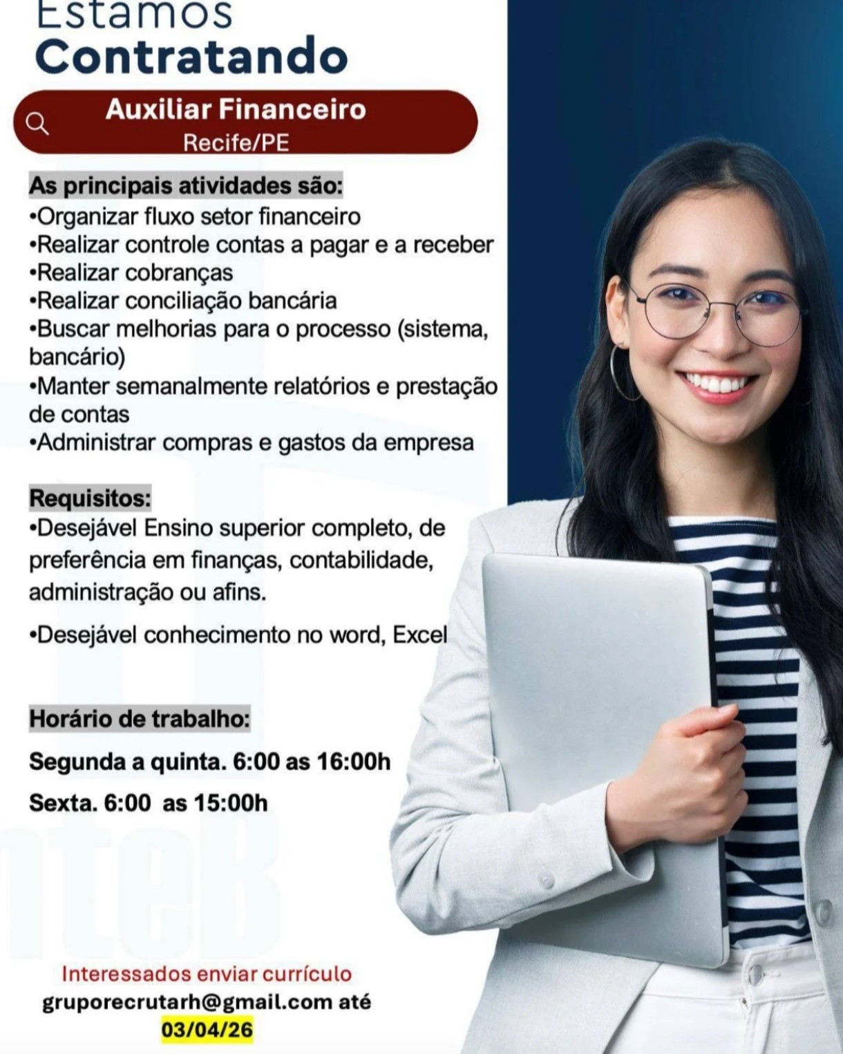 As informações sobre a vaga de emprego, como salário, remuneração, benefícios, requisitos, local de trabalho, forma de candidatura (e-mail ou whatsapp para enviar seu currículo) etc., estarão na imagem acima, caso estejam disponíveis.