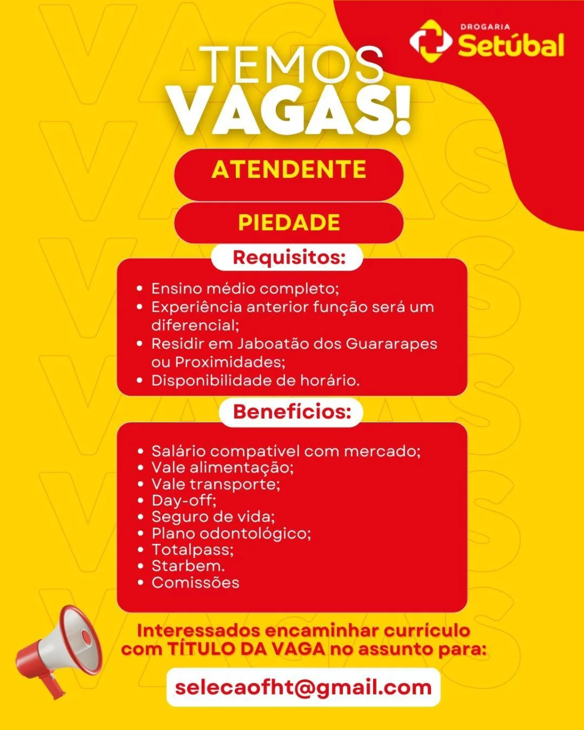 1 Vaga de emprego para Atendente em Drogaria Setúbal nesta terça-feira (31/03)