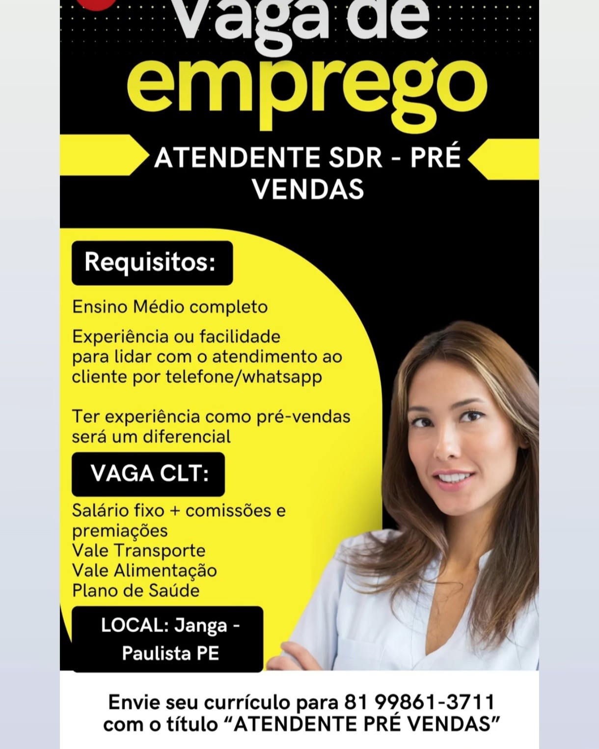 As informações sobre a vaga de emprego, como salário, remuneração, benefícios, requisitos, local de trabalho, forma de candidatura (e-mail ou whatsapp para enviar seu currículo) etc., estarão na imagem acima, caso estejam disponíveis.