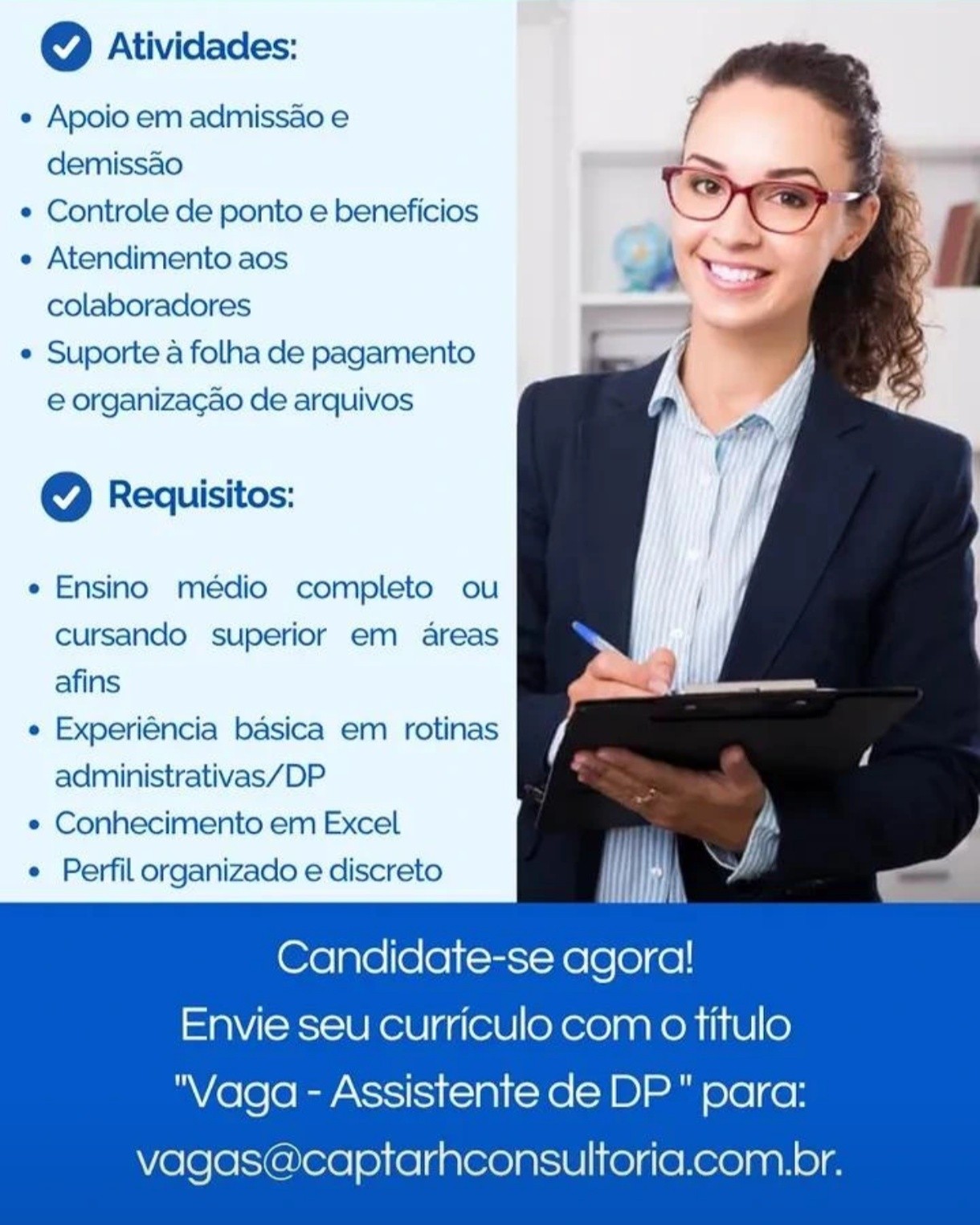 1 Vaga de emprego para Auxiliar / Assistente de Rh (recursos humanos) em Captarhconsultoria (Domínio Presente E‑Mail ) nesta sexta-feira (24/04)