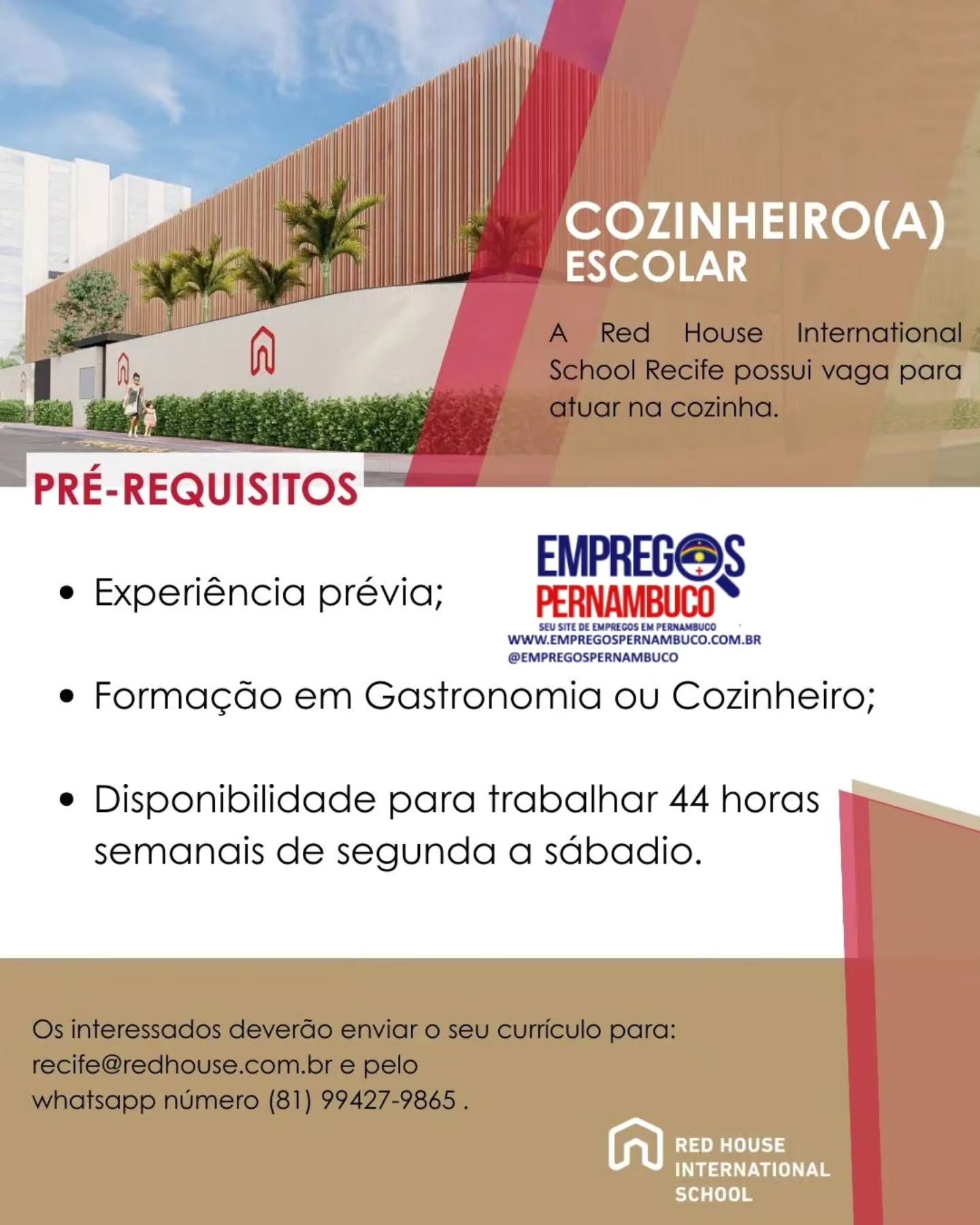 1 Vaga de emprego para Auxiliar de Cozinha / Cozinheiro(a) em Red House International School nesta sexta-feira (24/04)