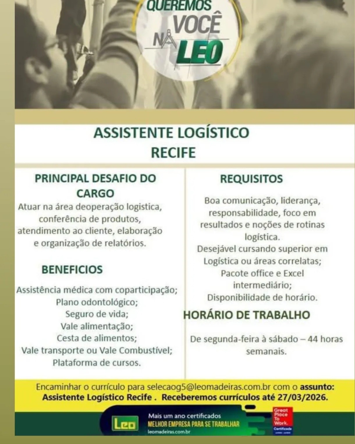 1 Vaga de emprego para Auxiliar De Logística em Leo (Leomadeiras.com.br) / Visível nesta quarta-feira (01/04)