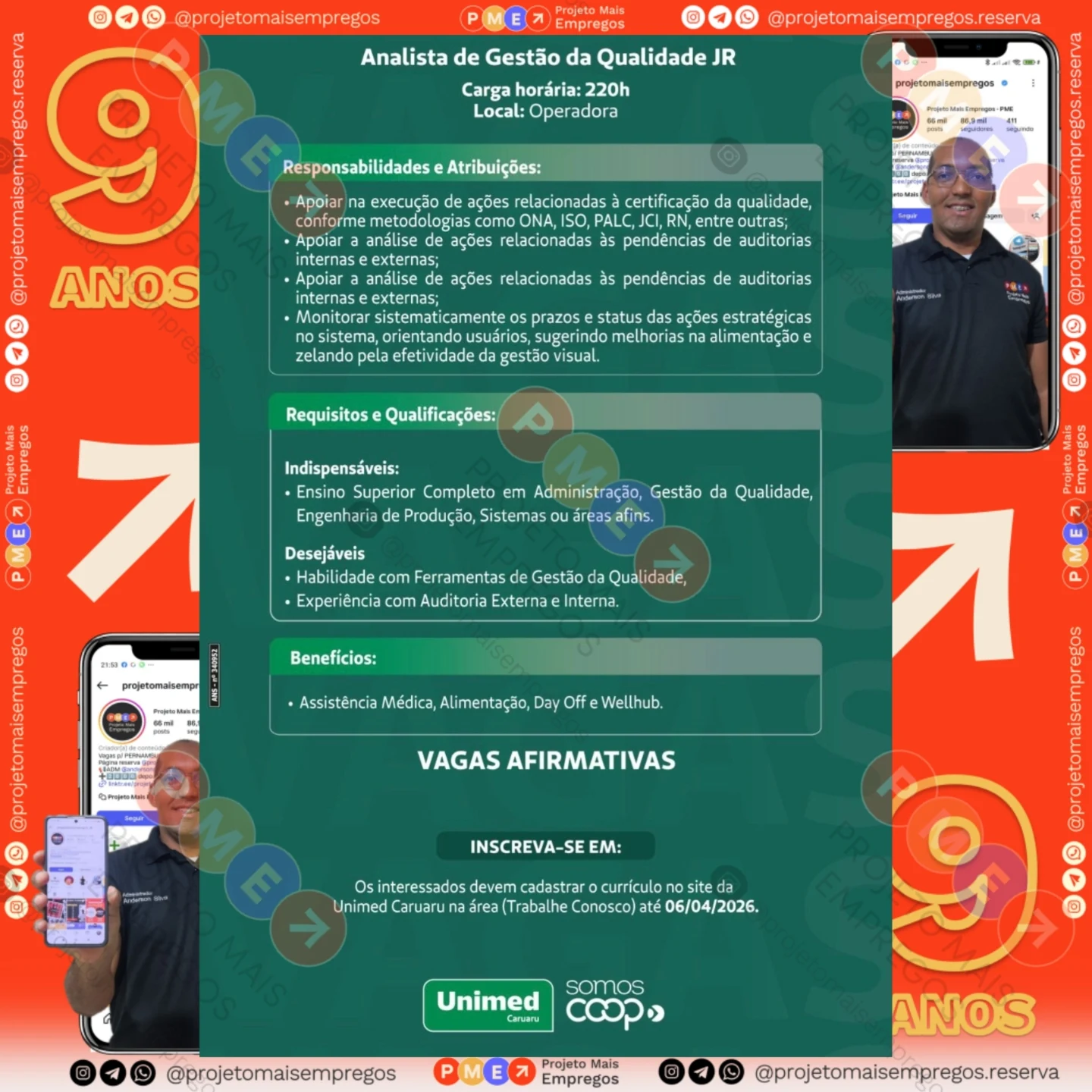 As informações sobre a vaga de emprego, como salário, remuneração, benefícios, requisitos, local de trabalho, forma de candidatura (e-mail ou whatsapp para enviar seu currículo) etc., estarão na imagem acima, caso estejam disponíveis.