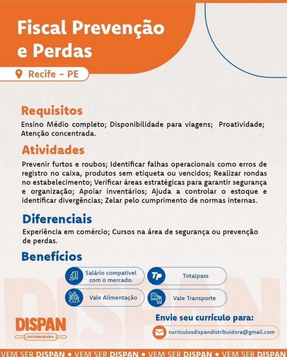 Benefícios: AUXILIAR DE PREVENÇÃO DE PERDAS: vale-alimentação, vale-transporte