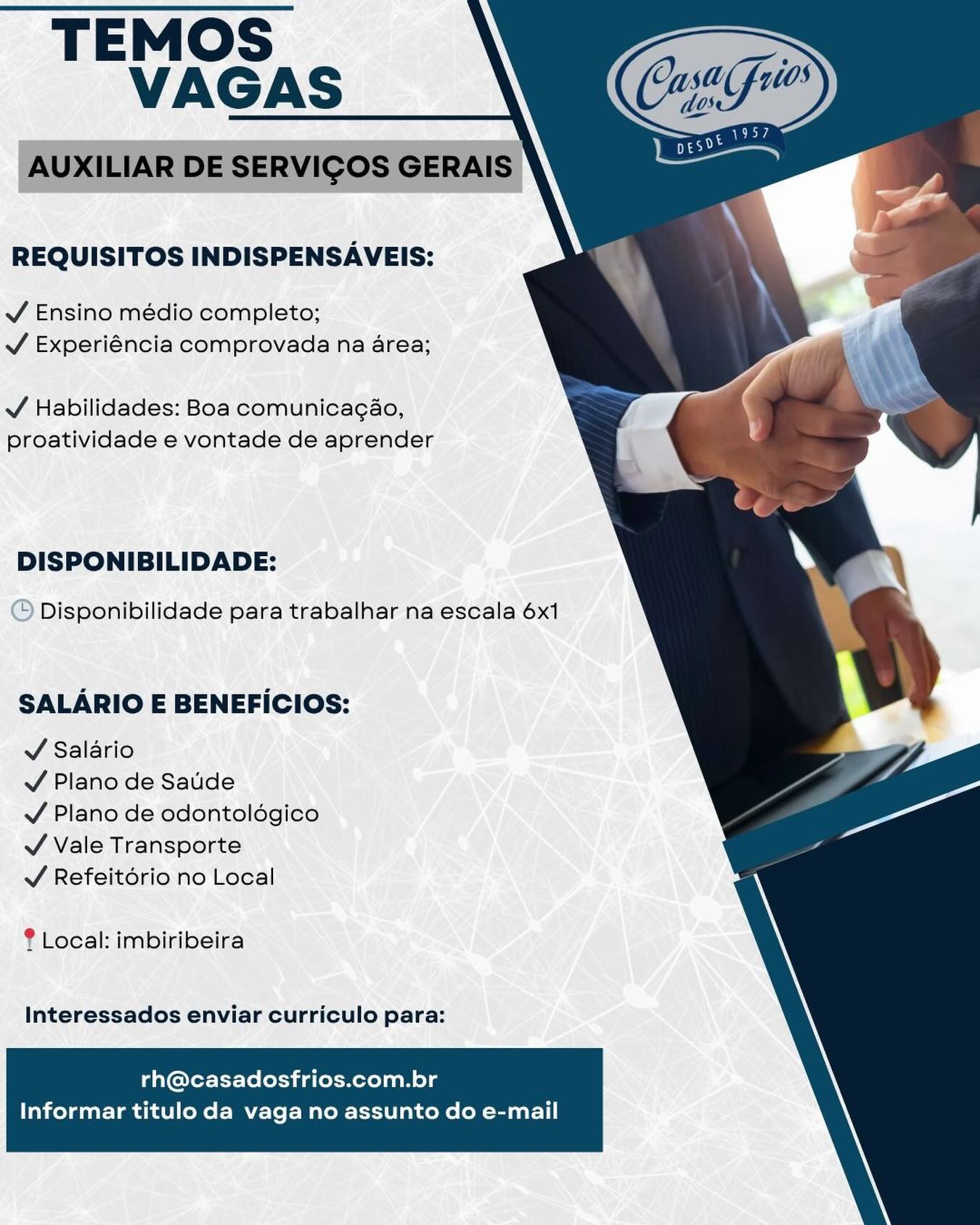 1 Vaga de emprego para Auxiliar de Serviços Gerais / Limpeza em Casa Dos Frios nesta sexta-feira (10/04)