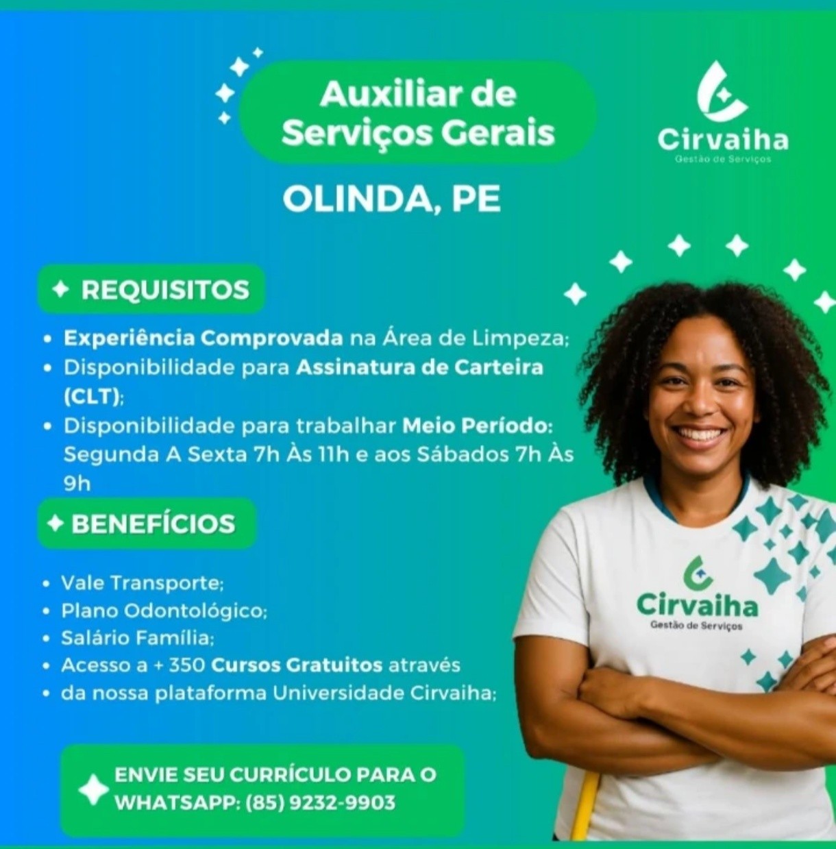As informações sobre a vaga de emprego, como salário, remuneração, benefícios, requisitos, local de trabalho, forma de candidatura (e-mail ou whatsapp para enviar seu currículo) etc., estarão na imagem acima, caso estejam disponíveis.