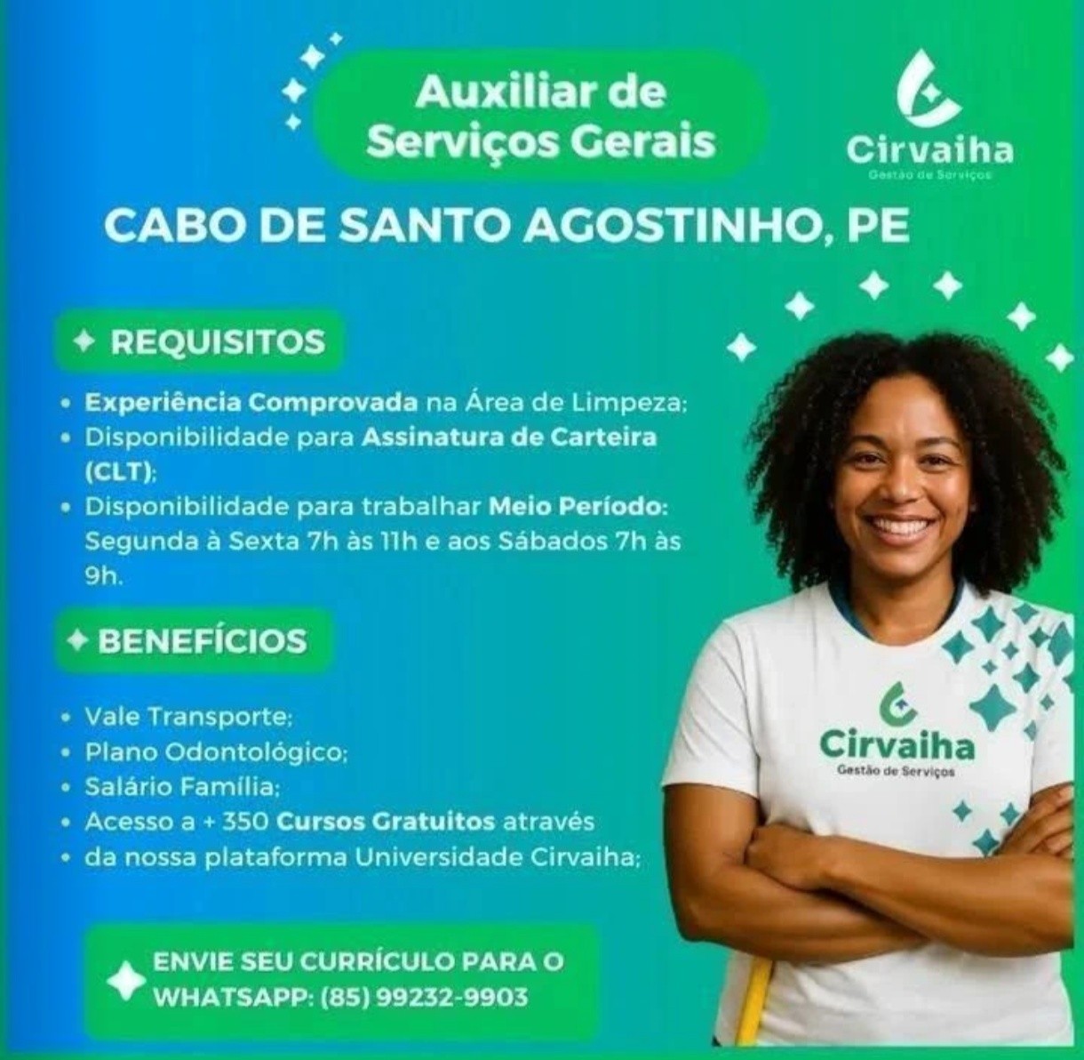1 Vaga de emprego para Auxiliar de Serviços Gerais / Limpeza em Cirvaiha – Gestão De Serviços nesta quarta-feira (22/04)