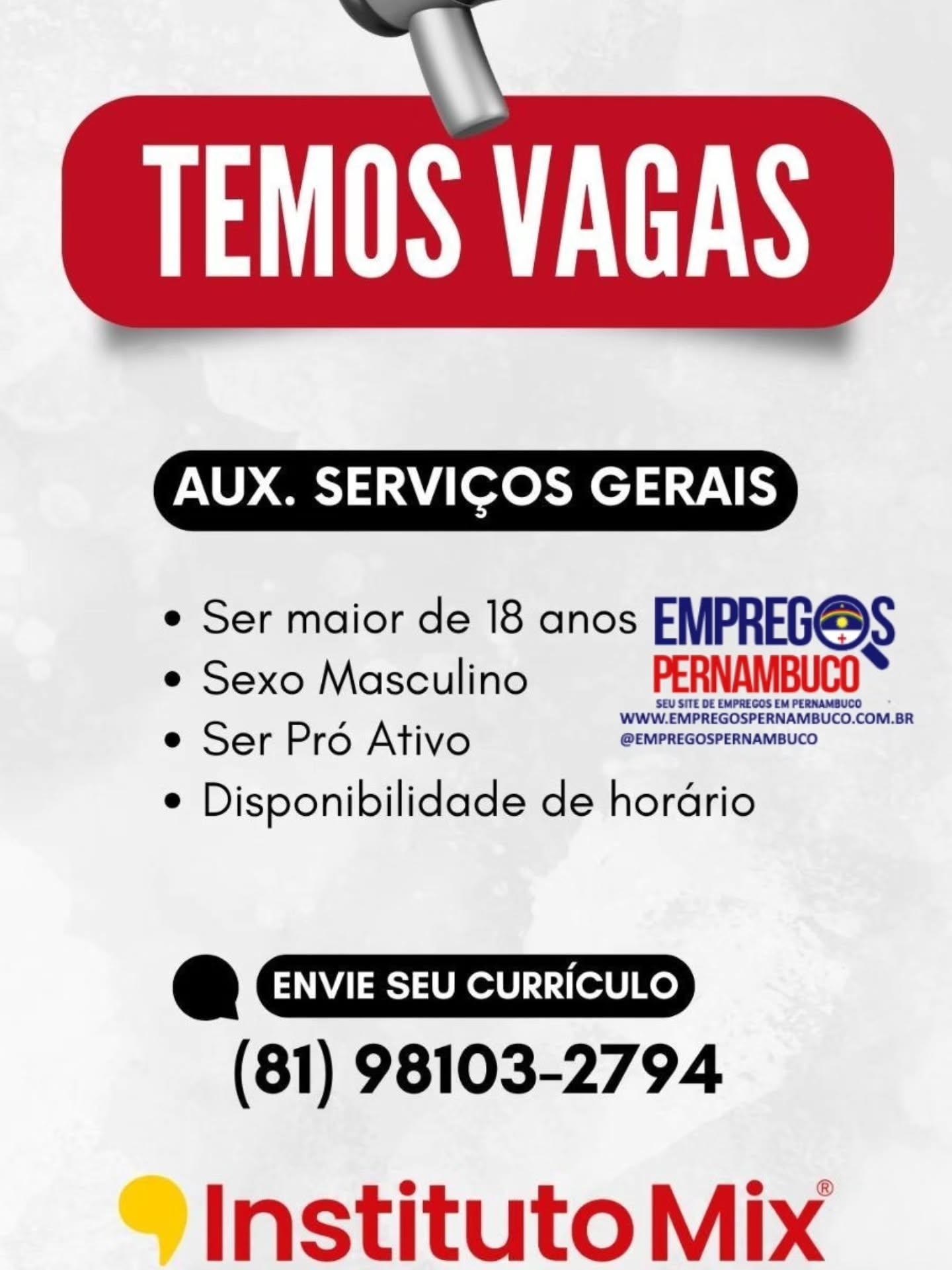 1 Vaga de emprego para Auxiliar de Serviços Gerais / Limpeza em Instituto Mix / Empregos Pernambuco nesta segunda-feira (13/04)