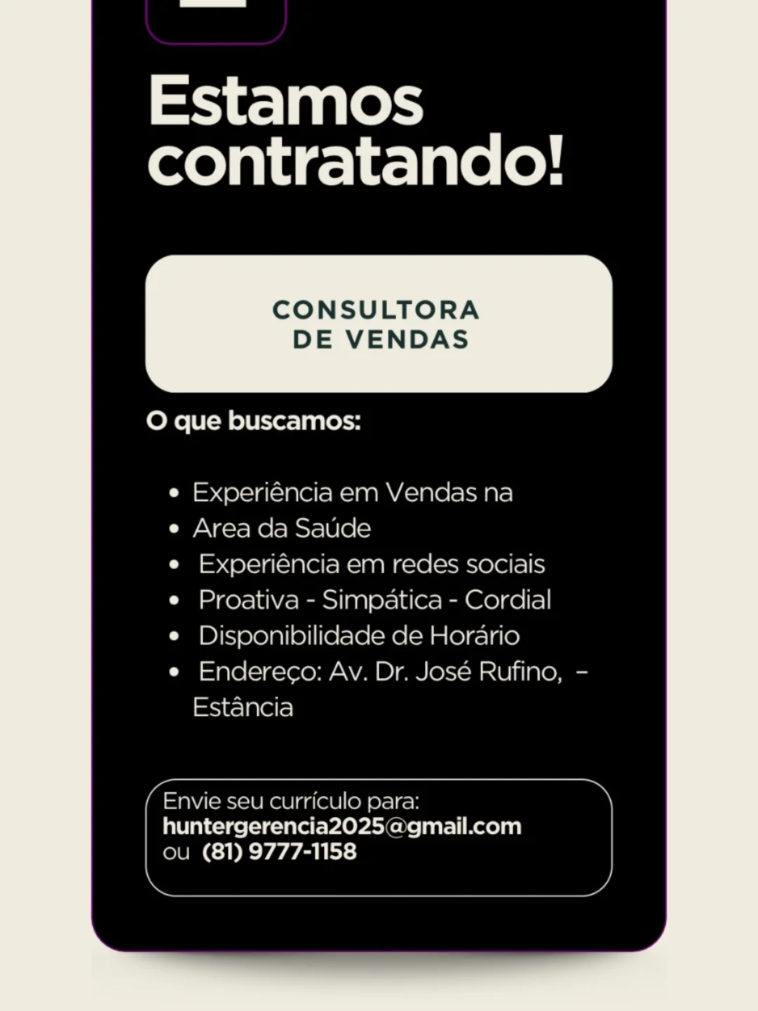 As informações sobre a vaga de emprego, como salário, remuneração, benefícios, requisitos, local de trabalho, forma de candidatura (e-mail ou whatsapp para enviar seu currículo) etc., estarão na imagem abaixo, caso estejam disponíveis.👇