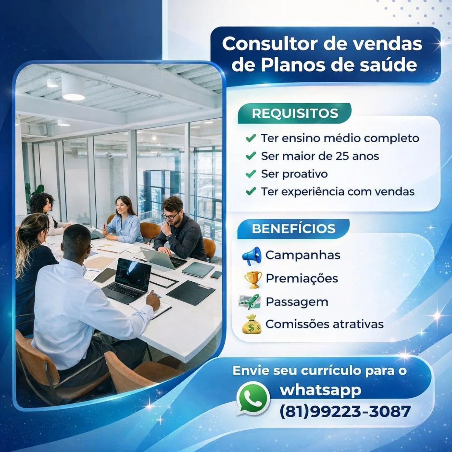 As informações sobre a vaga de emprego, como salário, remuneração, benefícios, requisitos, local de trabalho, forma de candidatura (e-mail ou whatsapp para enviar seu currículo) etc., estarão na imagem acima, caso estejam disponíveis.