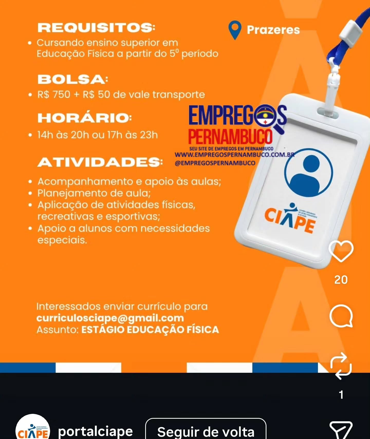 Link do post: https://www.instagram.com/empregospernambuco/p/DW6uBGnDp7Y/