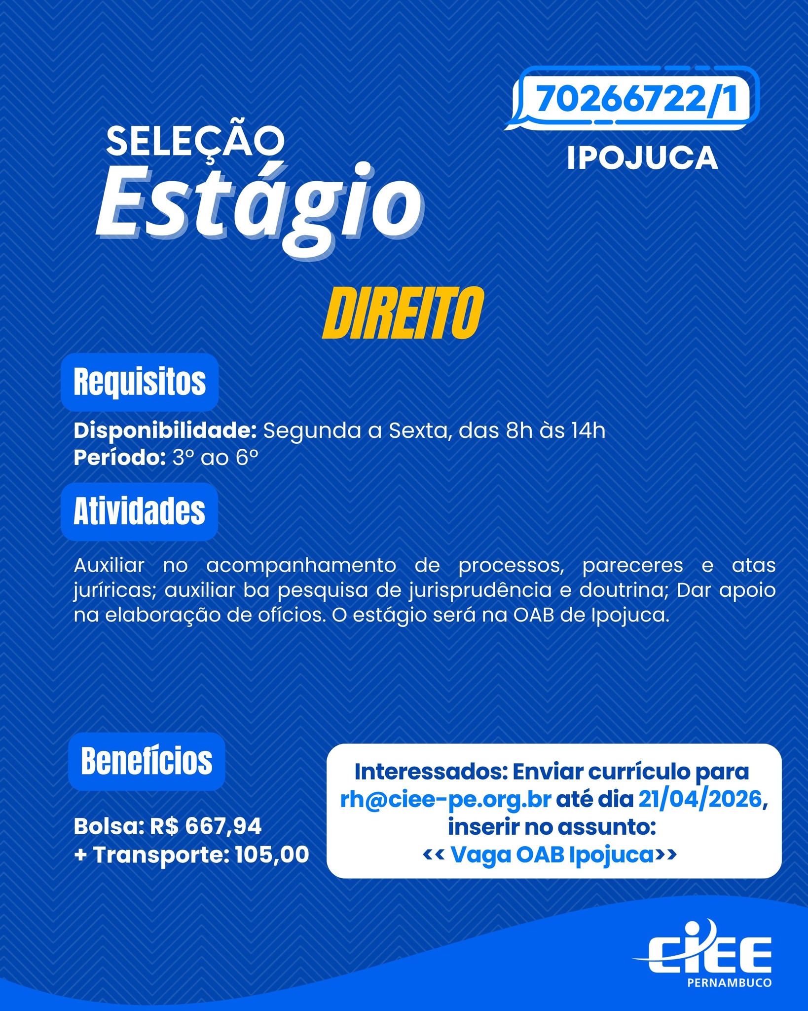 1 Vaga de emprego para Estagiário(a) em Oab De Ipojuca neste sábado (18/04)