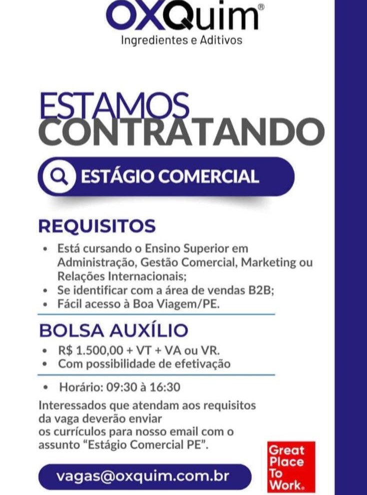 1 Vaga de emprego para Estagiário(A) em Oxquim (Ingredientes E Aditivos) nesta quinta-feira (26/03)