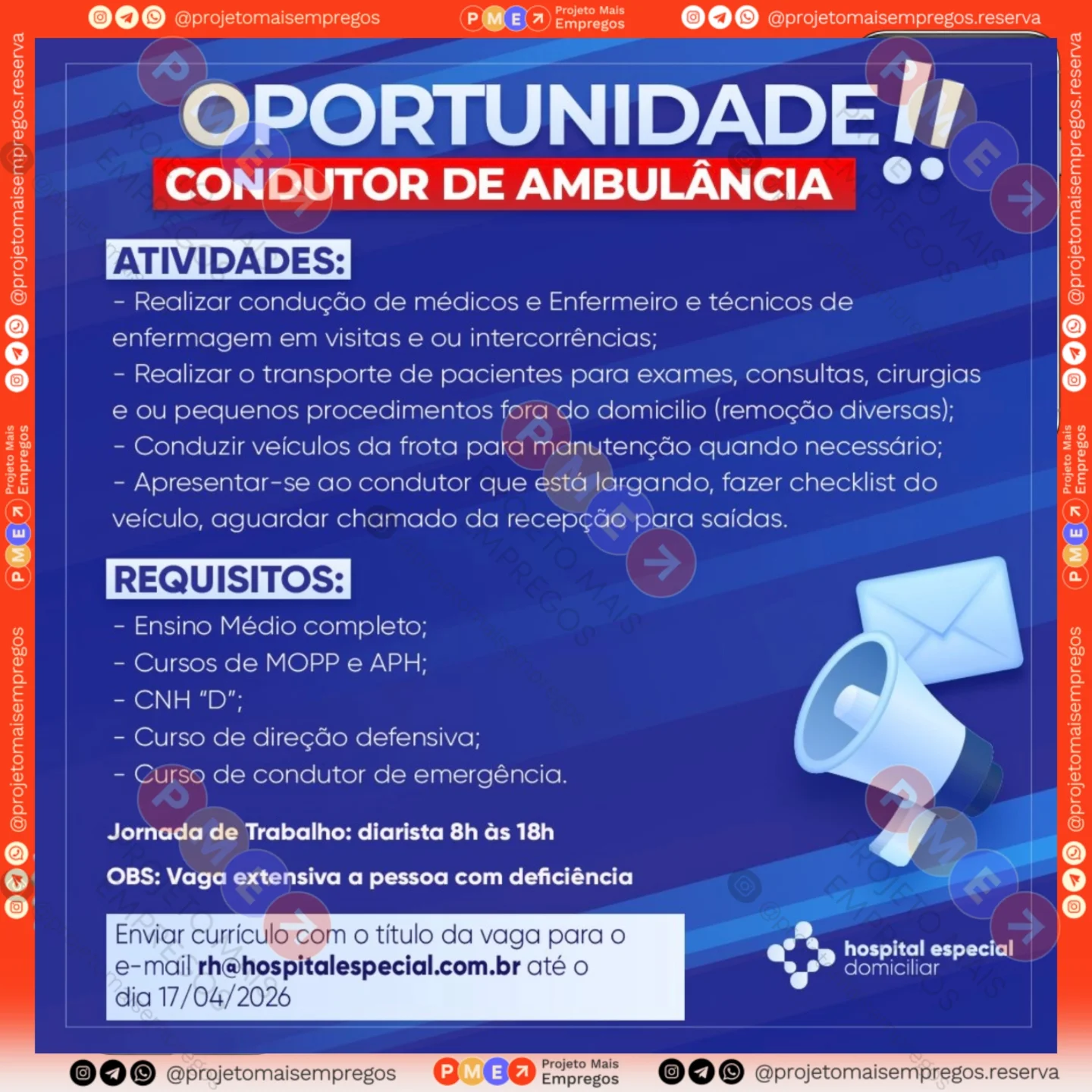 1 Vaga de emprego para Motorista em Hospital Especial Domiciliar neste sábado (18/04)
