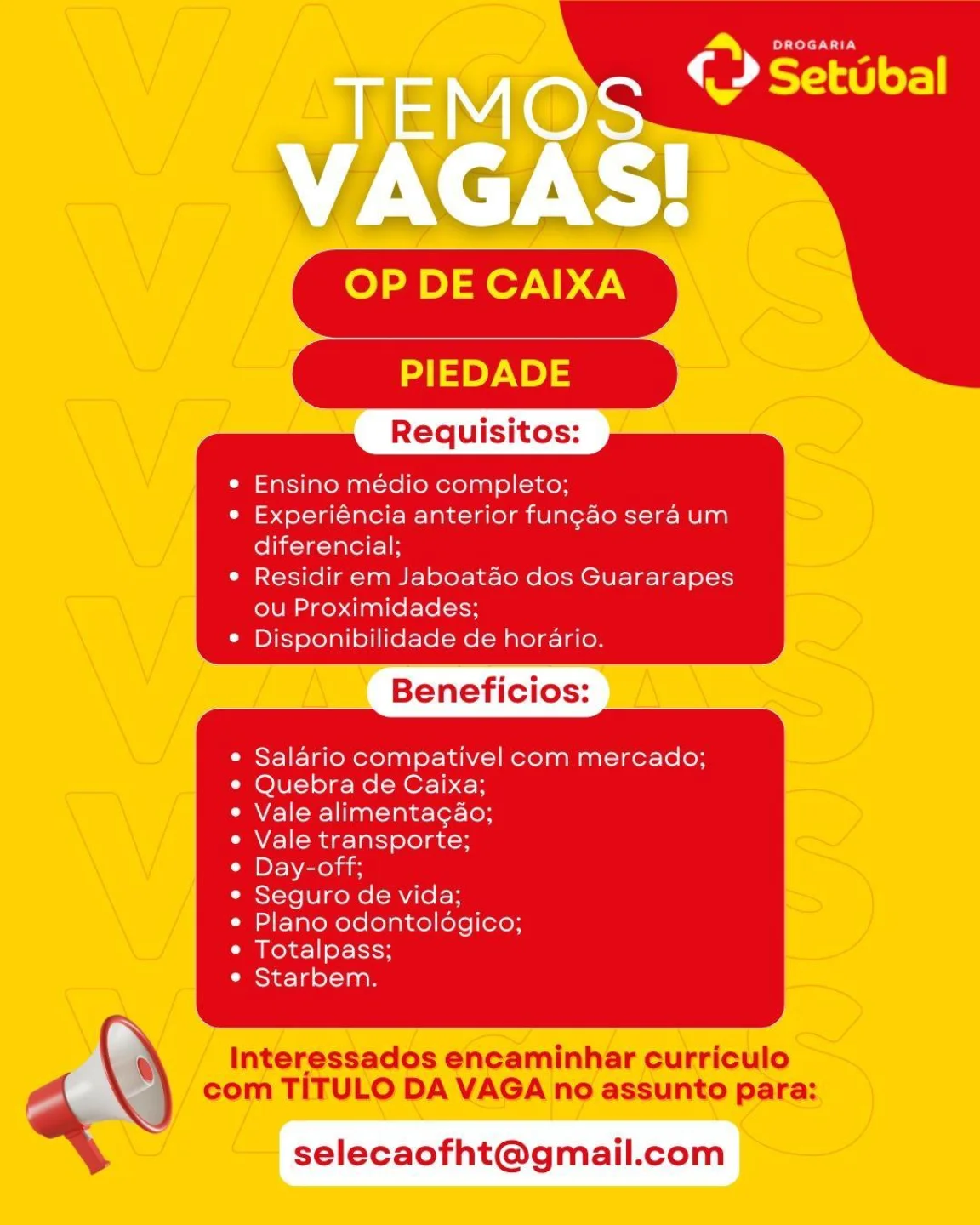 As informações sobre a vaga de emprego, como salário, remuneração, benefícios, requisitos, local de trabalho, forma de candidatura (e-mail ou whatsapp para enviar seu currículo) etc., estarão na imagem acima, caso estejam disponíveis.
