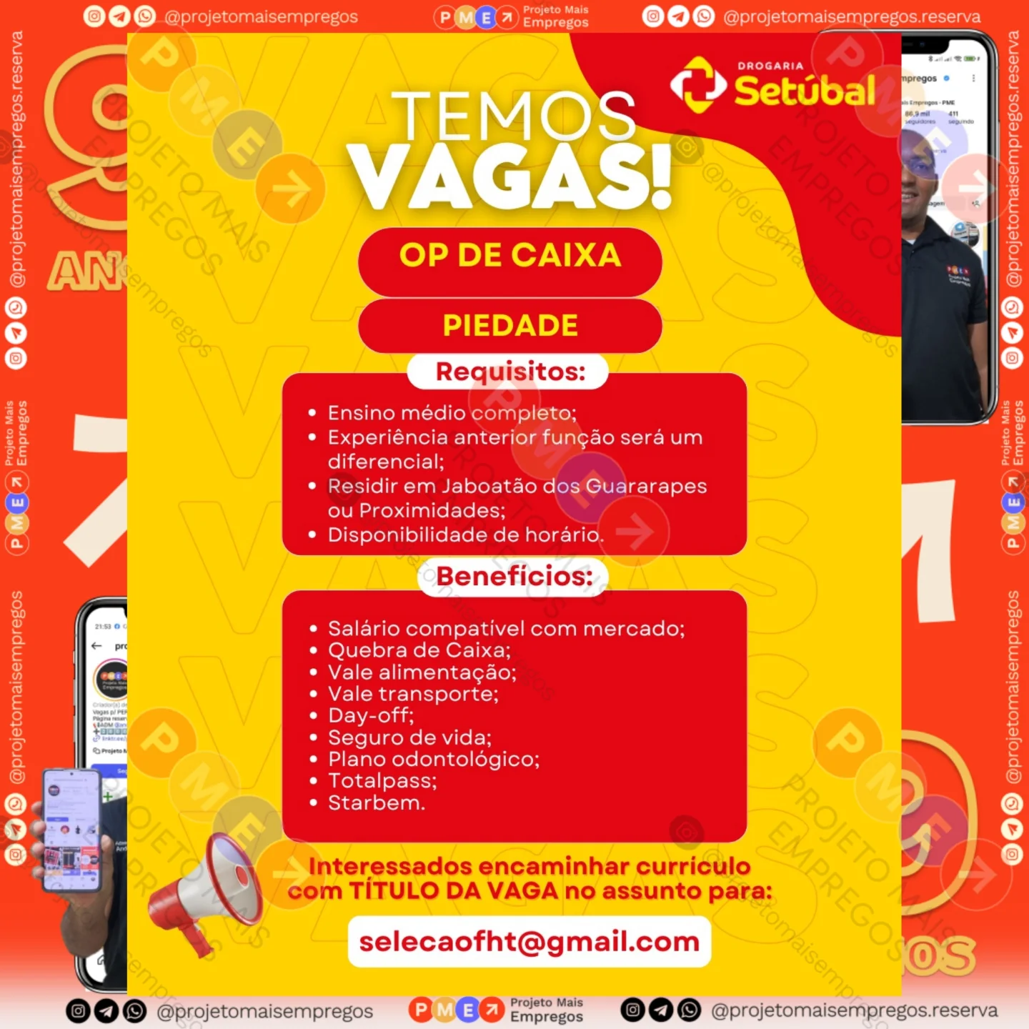 Benefícios: OPERADOR(A) DE CAIXA / CAIXA DE LOJA: day off de aniversário, plano odontológico, quebra de caixa, seguro de vida, vale-alimentação, vale-transporte