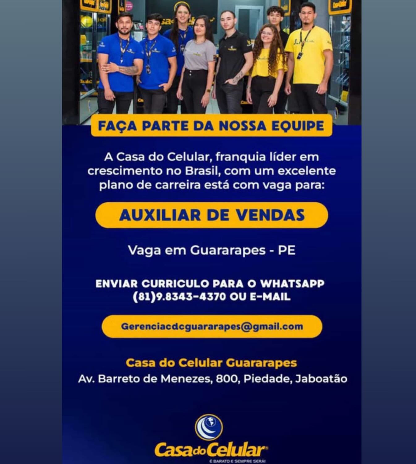 1 Vaga de emprego para Vendedor(a) em Casa Do Celular (Casa Do Celular Guararapes) nesta sexta-feira (17/04)