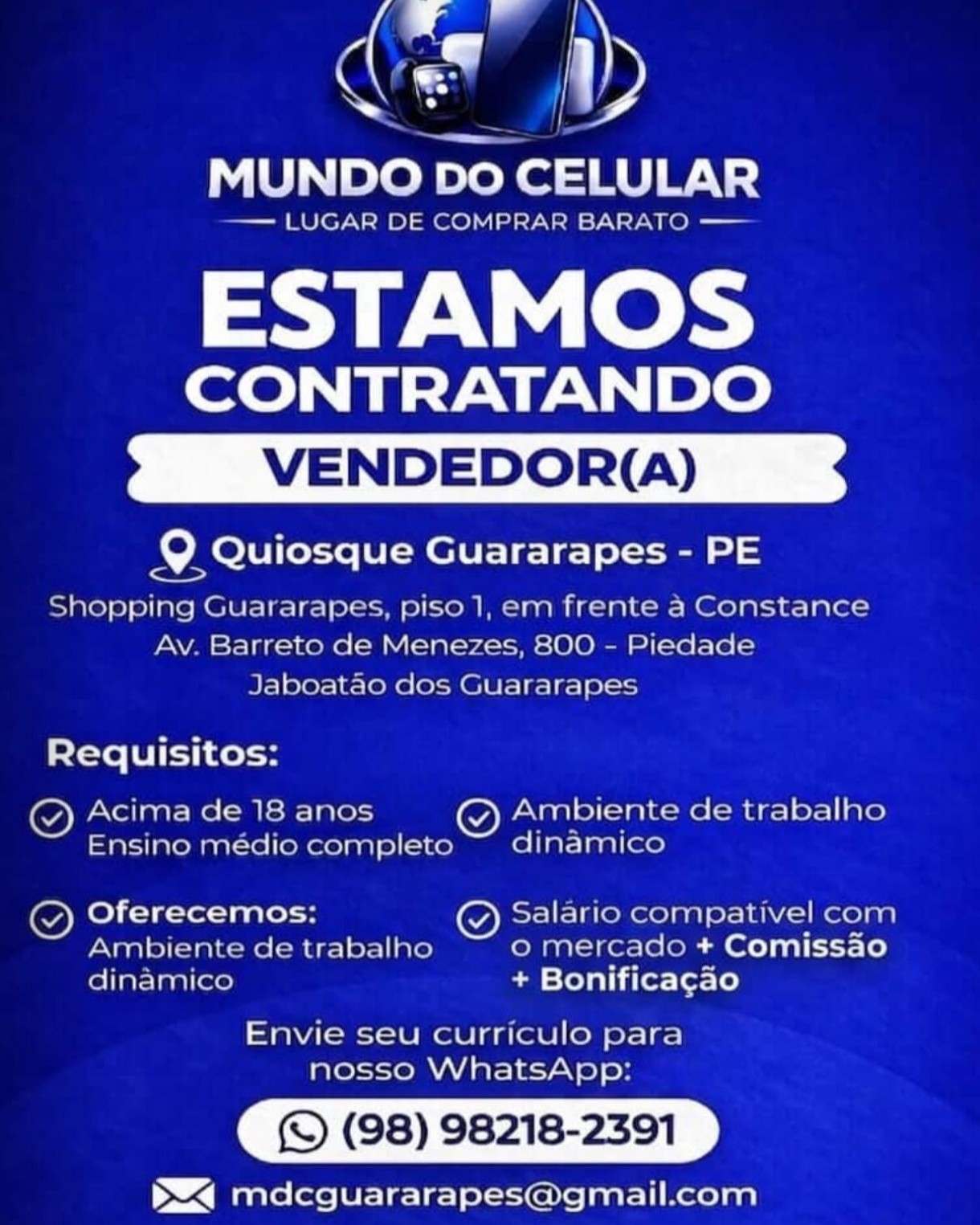 As informações sobre a vaga de emprego, como salário, remuneração, benefícios, requisitos, local de trabalho, forma de candidatura (e-mail ou whatsapp para enviar seu currículo) etc., estarão na imagem abaixo, caso estejam disponíveis.👇