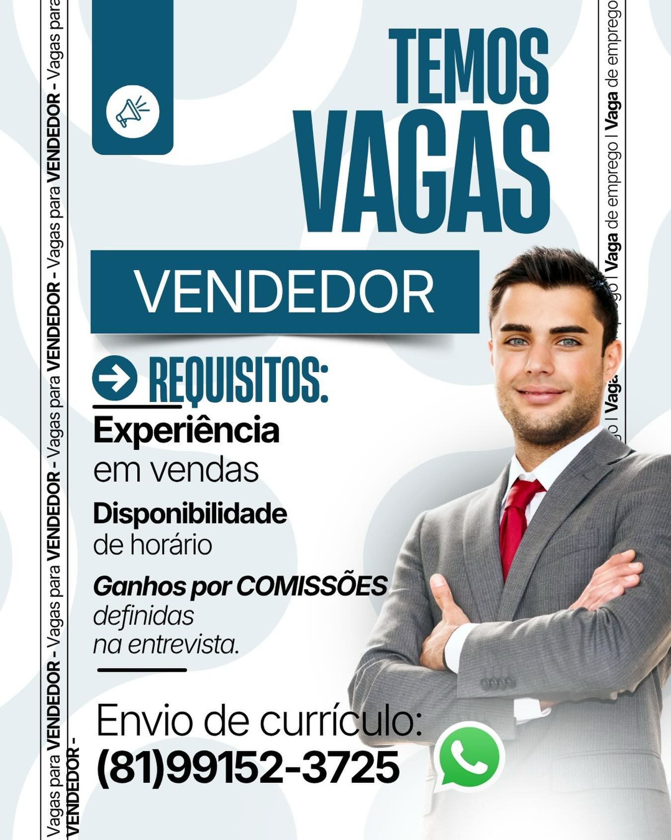 As informações sobre a vaga de emprego, como salário, remuneração, benefícios, requisitos, local de trabalho, forma de candidatura (e-mail ou whatsapp para enviar seu currículo) etc., estarão na imagem acima, caso estejam disponíveis.