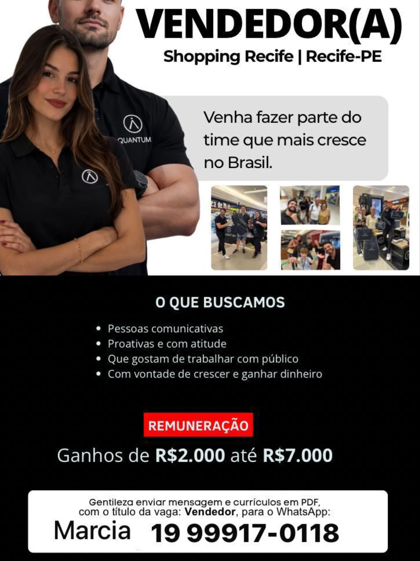 1 Vaga de emprego para Vendedor(a) em Quantum neste sábado (11/04)