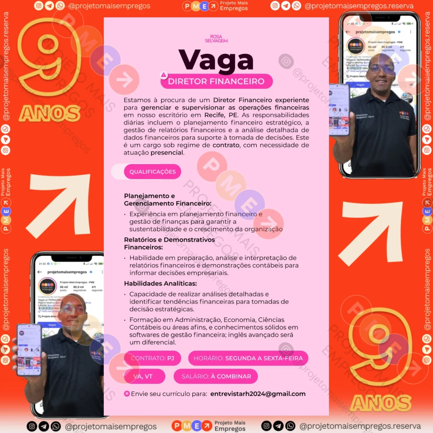 As informações sobre a vaga de emprego, como salário, remuneração, benefícios, requisitos, local de trabalho, forma de candidatura (e-mail ou whatsapp para enviar seu currículo) etc., estarão na imagem abaixo, caso estejam disponíveis.👇