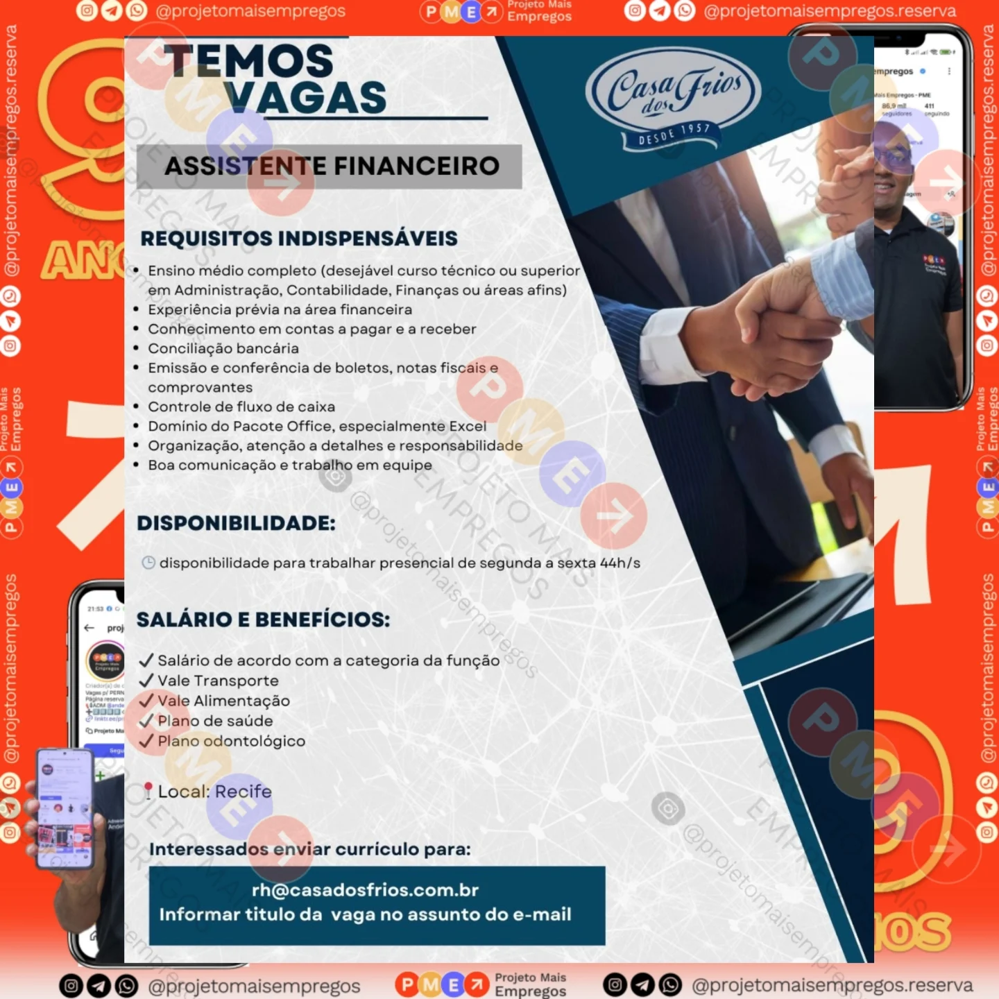 Benefícios: AUXILIAR / ASSISTENTE ADMINISTRATIVO: cesta básica, convênios, gympass/wellhub, vale-alimentação, vale-transporte; ANALISTA DE RH (RECURSOS HUMANOS): ajuda de custo, convênios, plano de saúde, plano odontológico, seguro de vida, vale-alimentação, vale-transporte; ASSISTENTE FINANCEIRO: ajuda de custo, plano de saúde, plano odontológico, seguro de vida, vale-alimentação, vale-transporte; ANALISTA CONTÁBIL: diversos benefícios