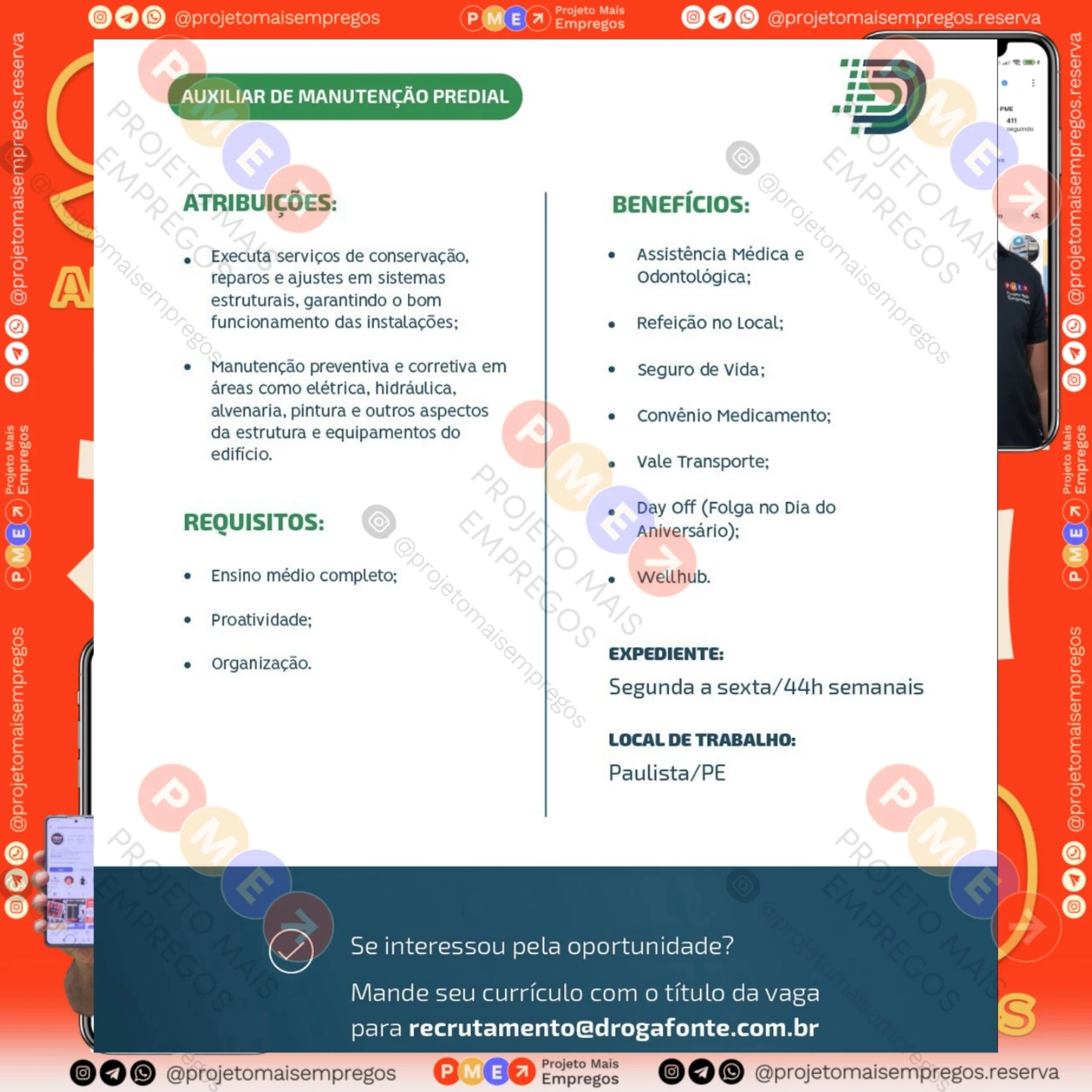 As informações sobre a vaga de emprego, como salário, remuneração, benefícios, requisitos, local de trabalho, forma de candidatura (e-mail ou whatsapp para enviar seu currículo) etc., estarão na imagem acima, caso estejam disponíveis.