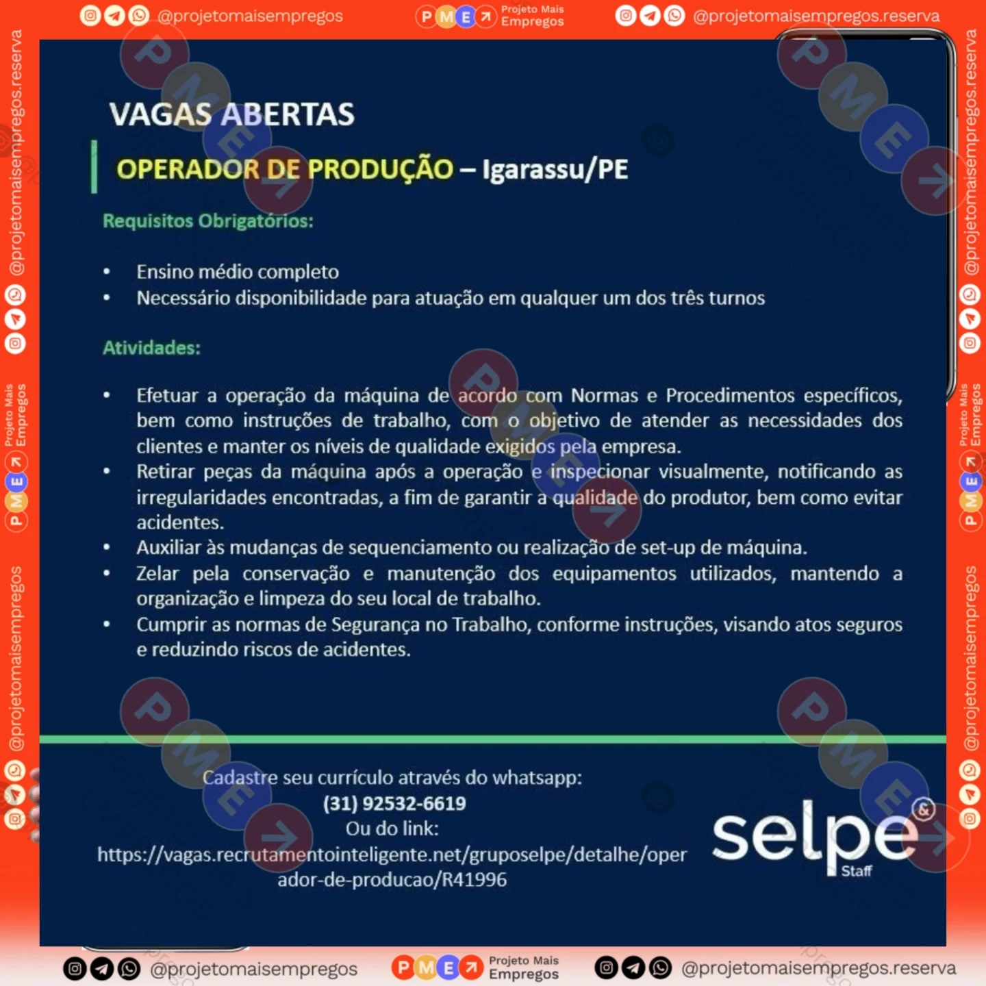 Quantidade de vagas: OPERADOR(A) DE PRODUÇÃO: 1; ENCARREGADO(A): 1; ENTREGADOR(A): 1; MOTORISTA: 1; SUPERVISOR(A): 1; CONFERENTE: 1; AUXILIAR DE LOGÍSTICA: 3; VIGIA / SEGURANCA: 1