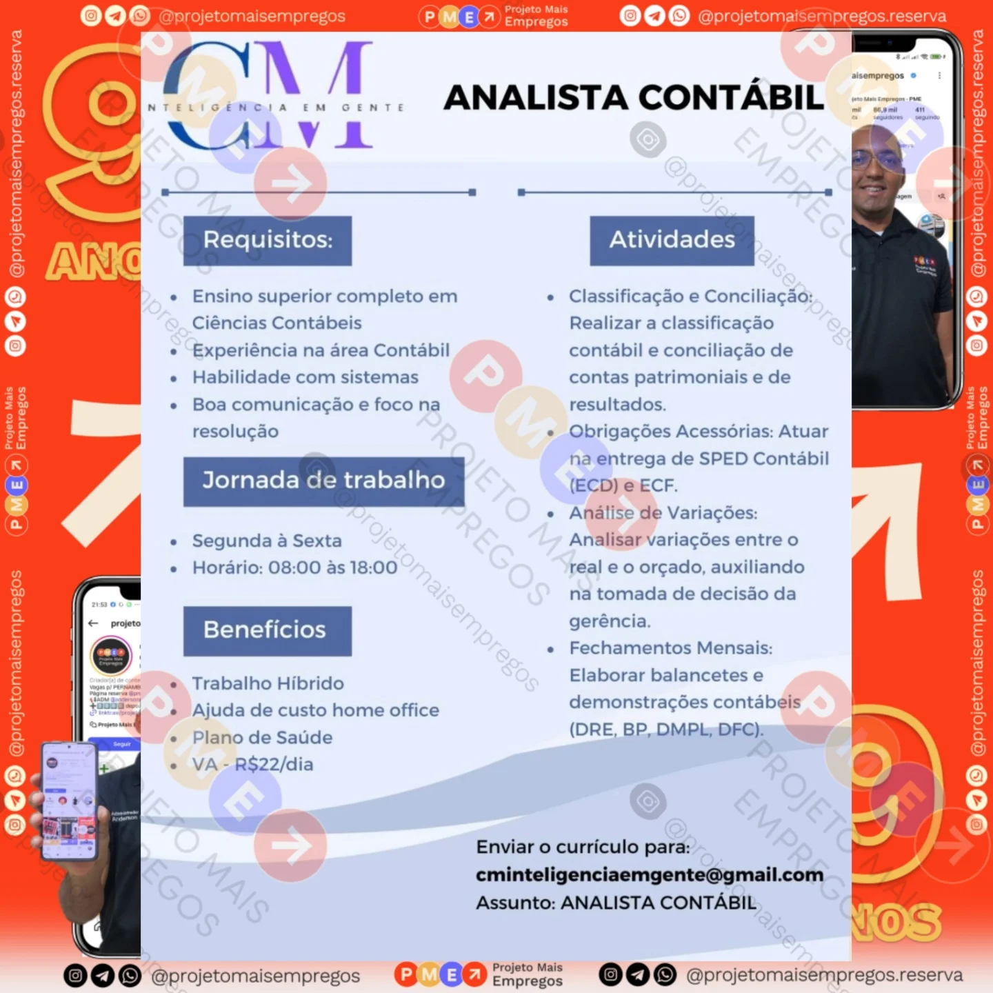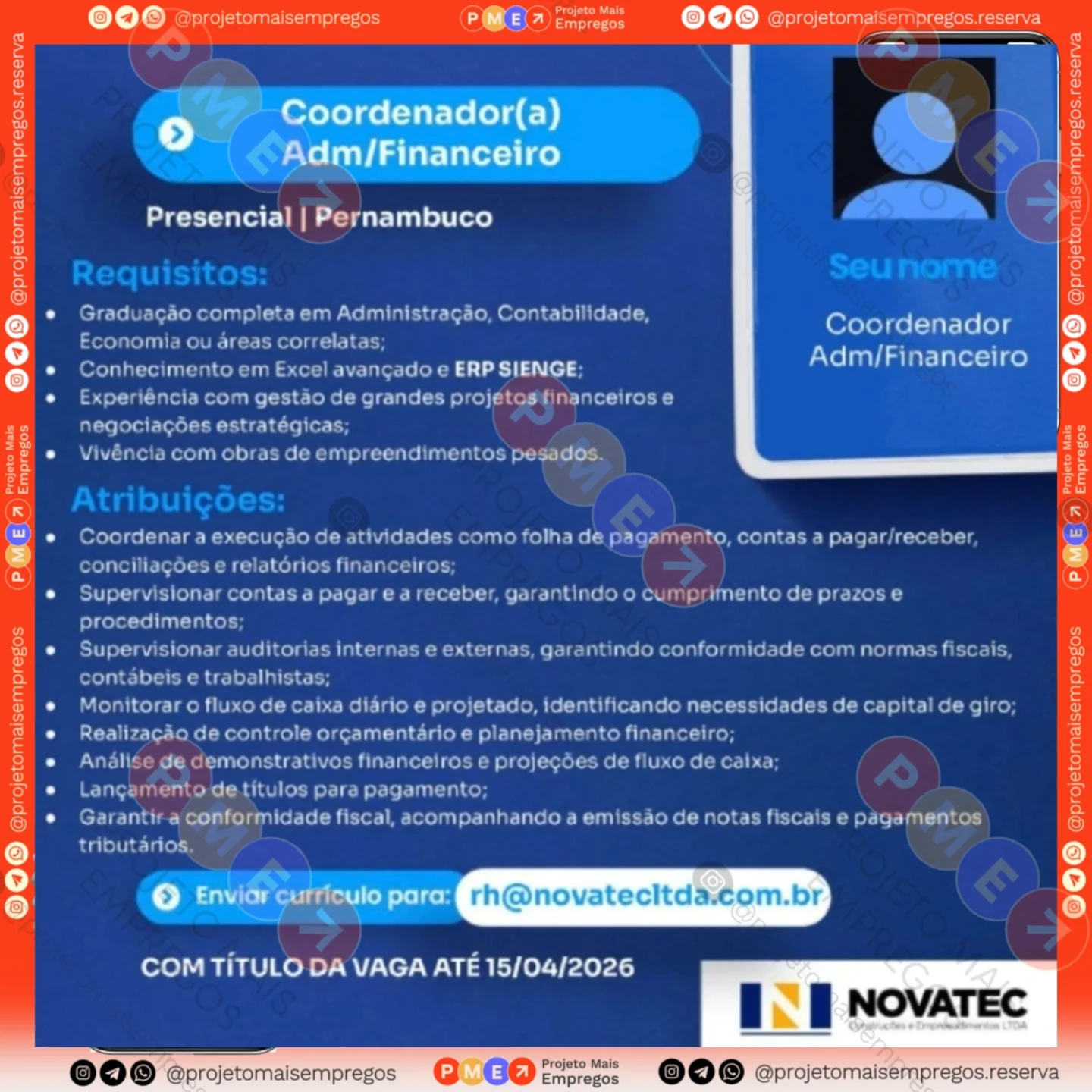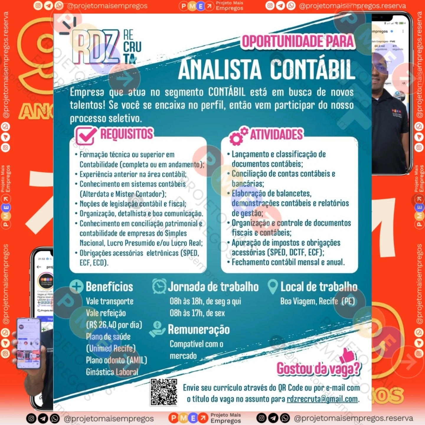 As informações sobre a vaga de emprego, como salário, remuneração, benefícios, requisitos, local de trabalho, forma de candidatura (e-mail ou whatsapp para enviar seu currículo) etc., estarão na imagem acima, caso estejam disponíveis.