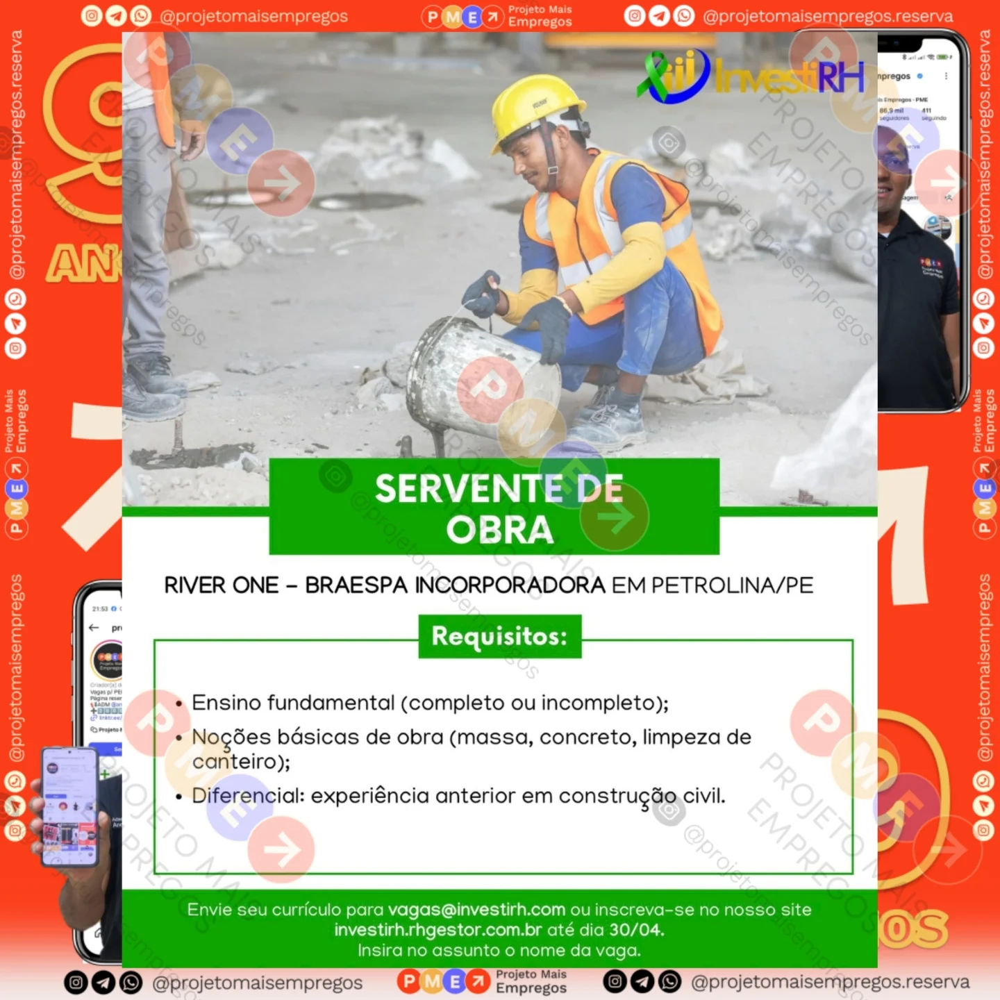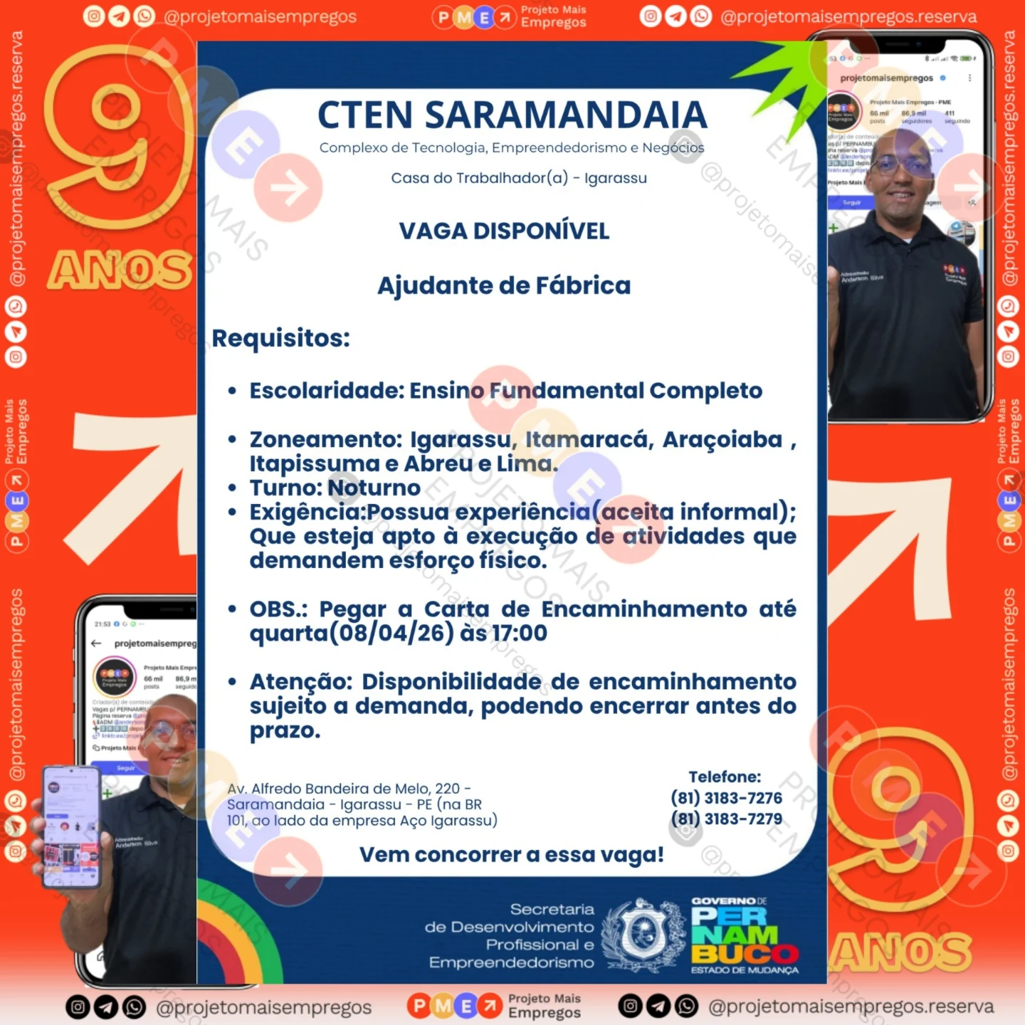 11 Vagas de emprego para Auxiliar de Produção, Técnico(a) de Seguranca do Trabalho, Estoquista, Pedreiro / Servente, Supervisor(a), Encarregado(a), Ajudante de Carga e Descarga em Pernambuco nesta quinta-feira (09/04)