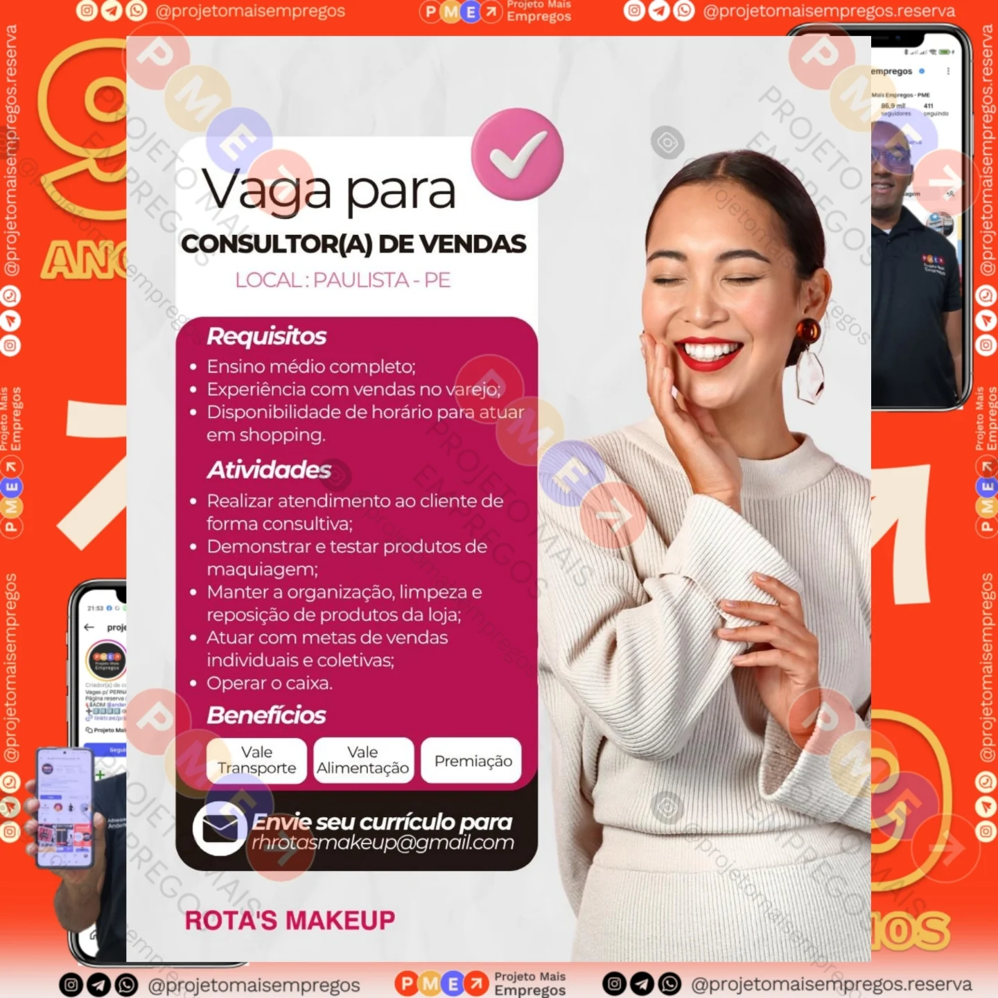 Benefícios: CONSULTOR(A) DE VENDAS: bonificação/premiação, comissão/gratificação, convênios, vale-alimentação, vale-transporte; VENDEDOR(A): cesta básica, convênios, plano de saúde, plano odontológico, vale-alimentação, vale-transporte; ATENDENTE: vale-alimentação, vale-transporte; PROMOTOR(A) DE VENDAS: convênios, day off de aniversário, vale-alimentação, vale-transporte