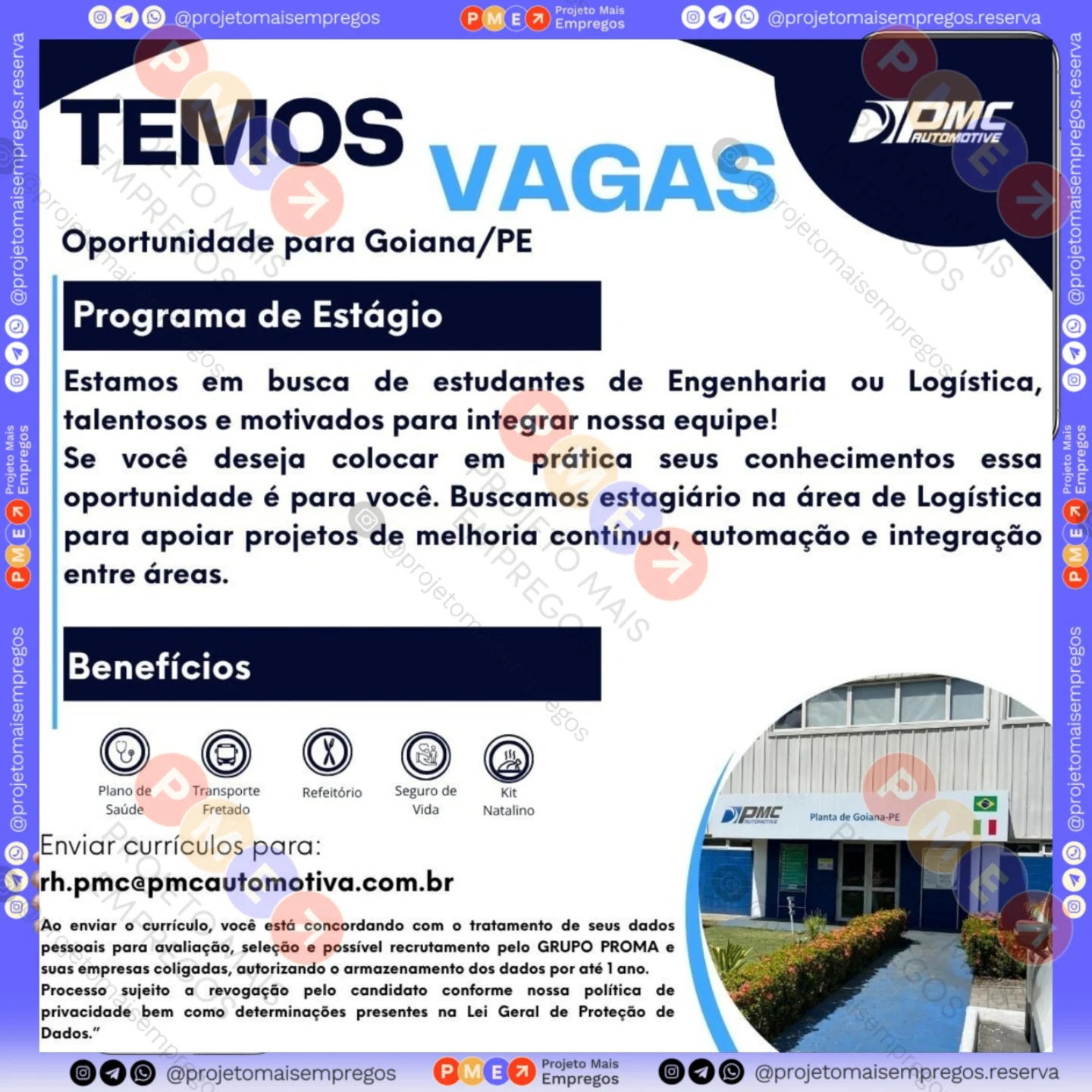 Benefícios: ESTAGIÁRIO(A): convênios, day off de aniversário, gympass/wellhub, plano de carreira, vale-alimentação, vale-transporte; AUXILIAR DE LOGÍSTICA: plano de saúde, refeição no local, seguro de vida, vale-transporte; AUXILIAR / ASSISTENTE ADMINISTRATIVO: diversos benefícios