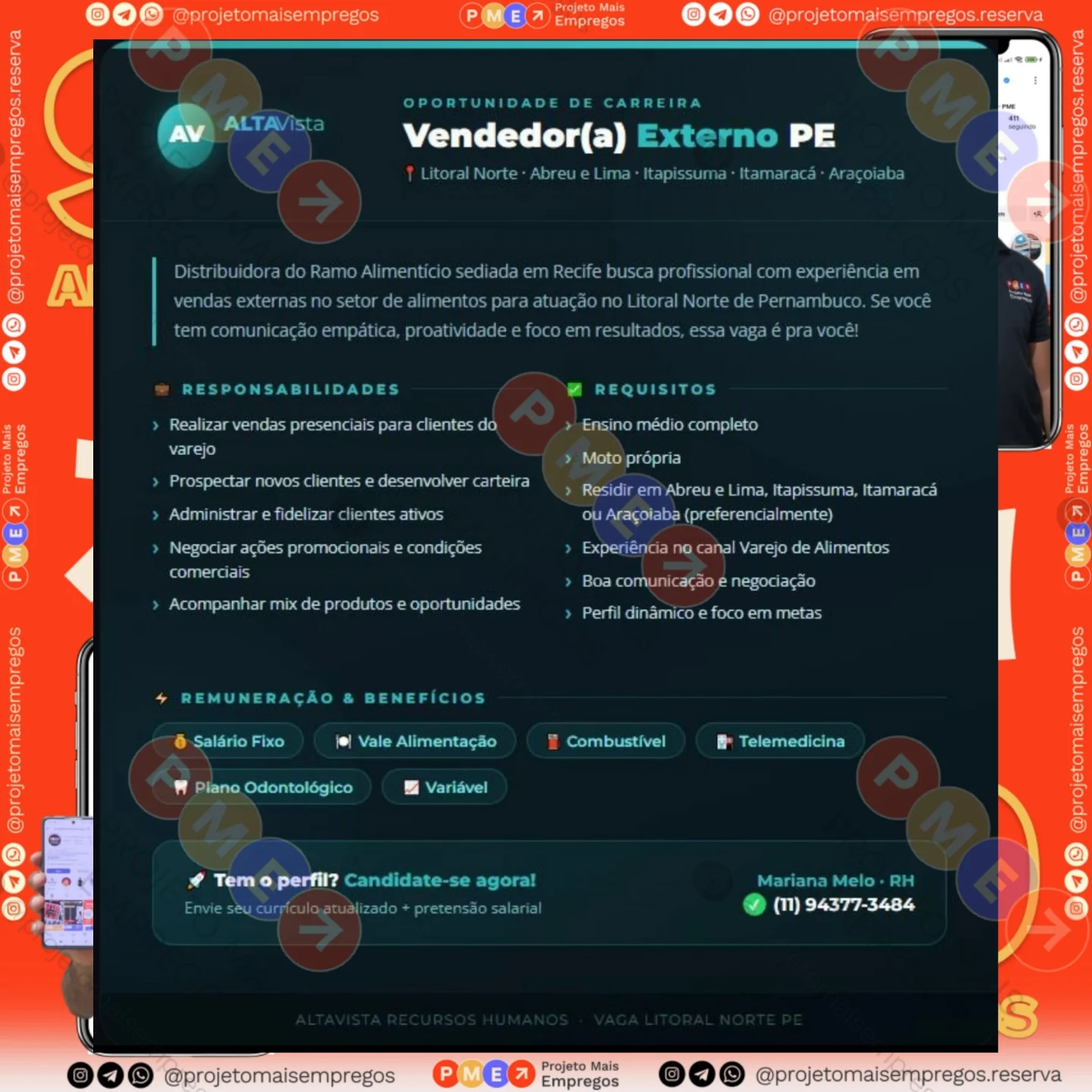 As informações sobre a vaga de emprego, como salário, remuneração, benefícios, requisitos, local de trabalho, forma de candidatura (e-mail ou whatsapp para enviar seu currículo) etc., estarão na imagem acima, caso estejam disponíveis.