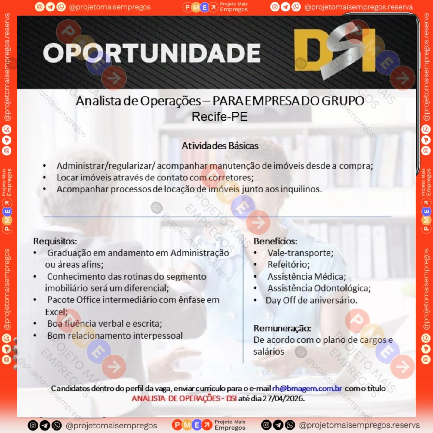 As informações sobre a vaga de emprego, como salário, remuneração, benefícios, requisitos, local de trabalho, forma de candidatura (e-mail ou whatsapp para enviar seu currículo) etc., estarão na imagem acima, caso estejam disponíveis.