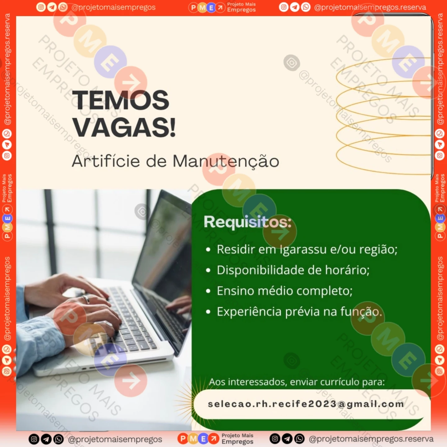As informações sobre a vaga de emprego, como salário, remuneração, benefícios, requisitos, local de trabalho, forma de candidatura (e-mail ou whatsapp para enviar seu currículo) etc., estarão na imagem abaixo, caso estejam disponíveis.👇
