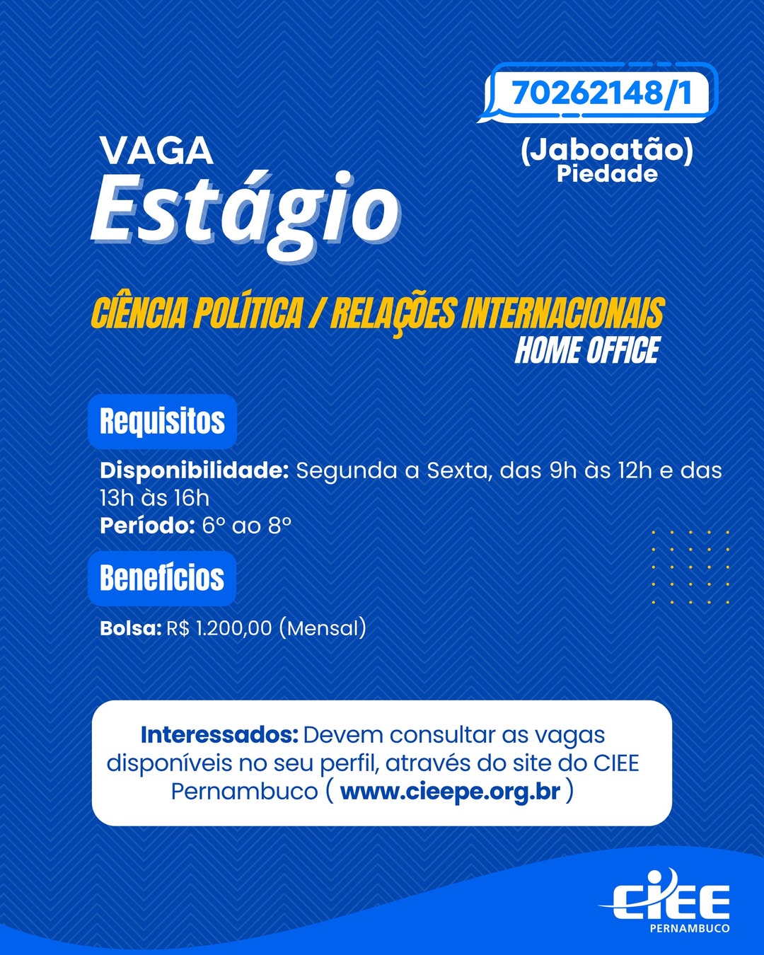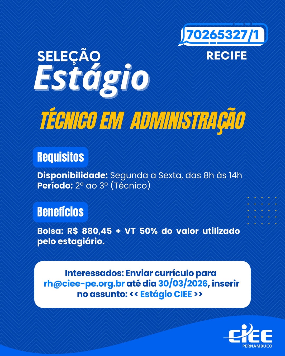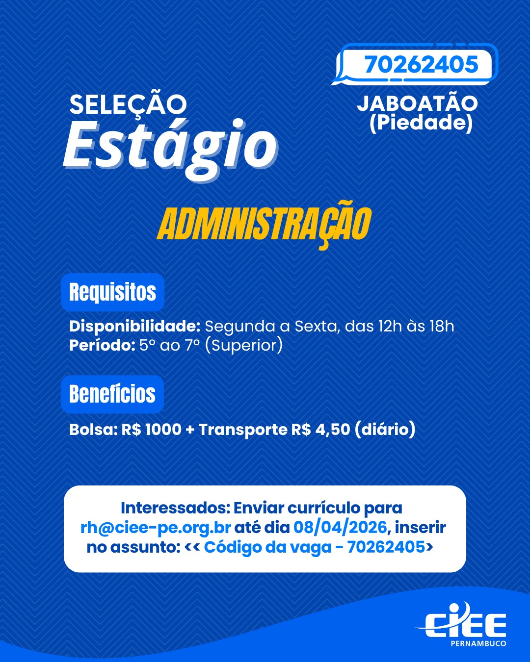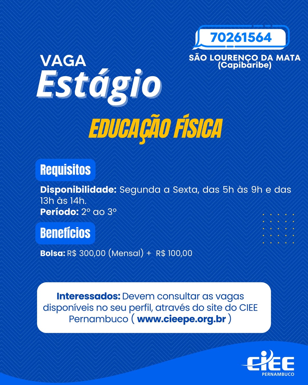 Quantidade de vagas: ESTAGIÁRIO(A): 12; JOVEM APRENDIZ: 1