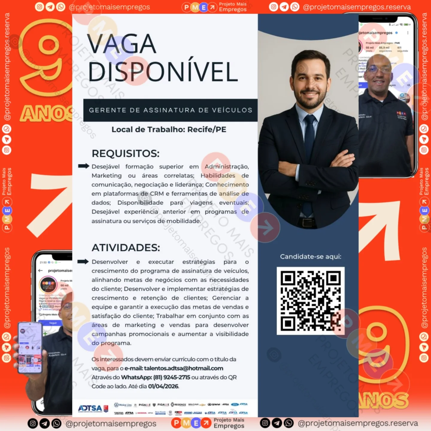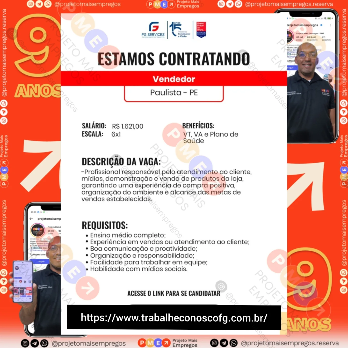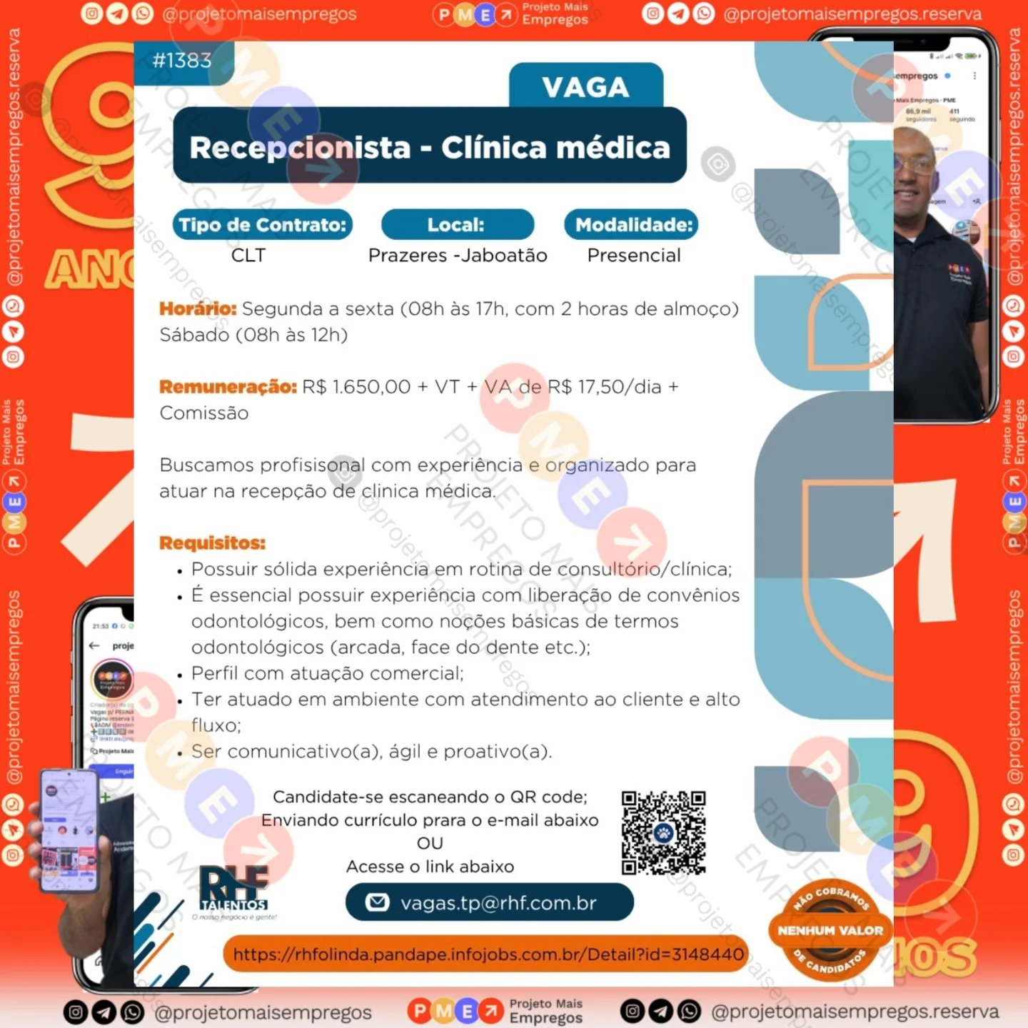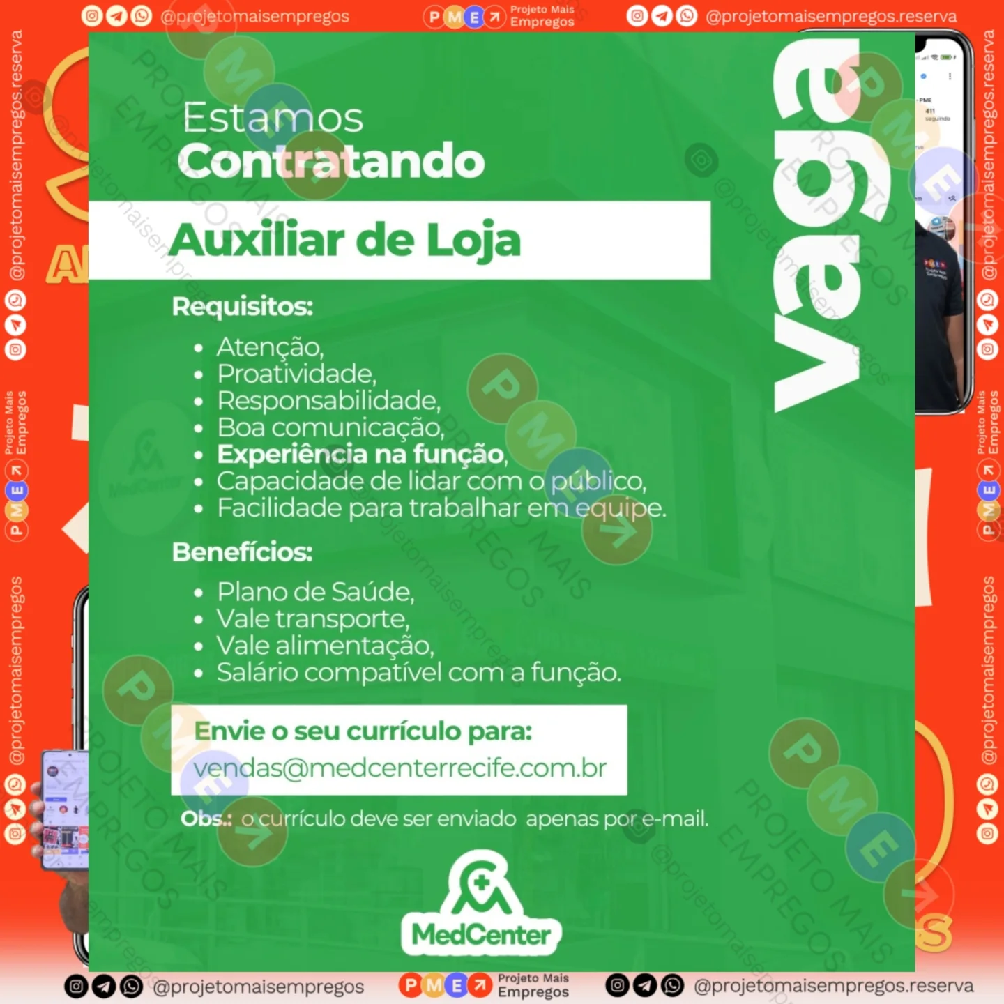 As informações sobre a vaga de emprego, como salário, remuneração, benefícios, requisitos, local de trabalho, forma de candidatura (e-mail ou whatsapp para enviar seu currículo) etc., estarão na imagem acima, caso estejam disponíveis.