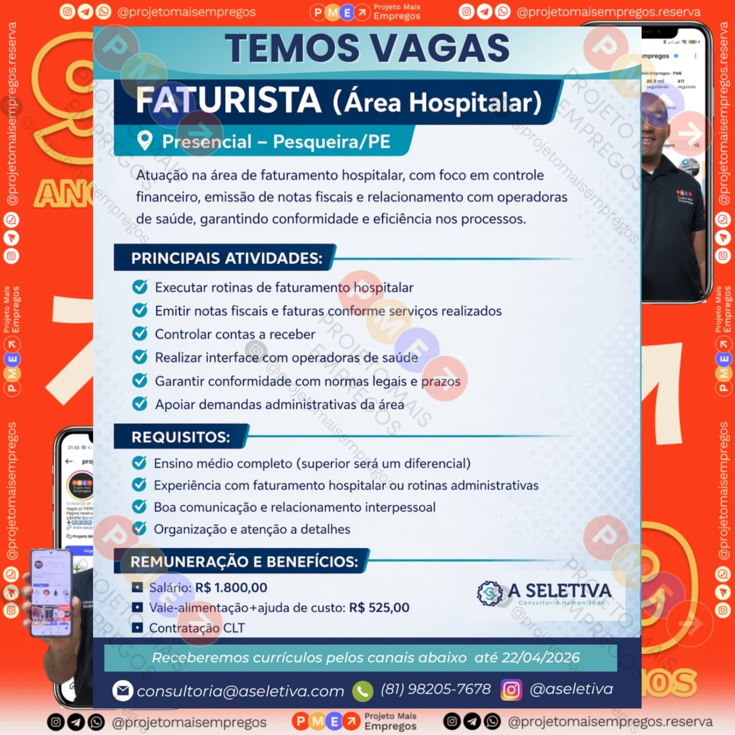 As informações sobre a vaga de emprego, como salário, remuneração, benefícios, requisitos, local de trabalho, forma de candidatura (e-mail ou whatsapp para enviar seu currículo) etc., estarão na imagem acima, caso estejam disponíveis.