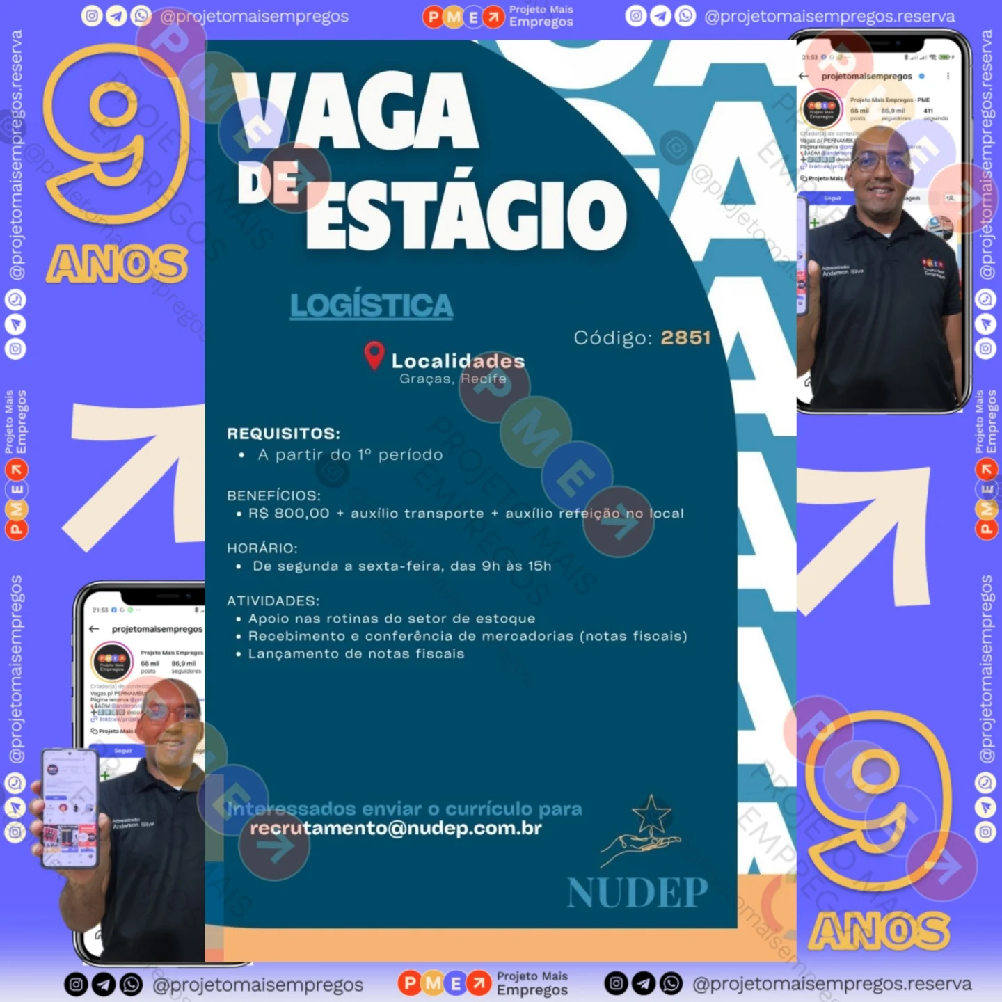 Quantidade de vagas: ESTAGIÁRIO(A): 15; AUXILIAR DE LOGÍSTICA: 2