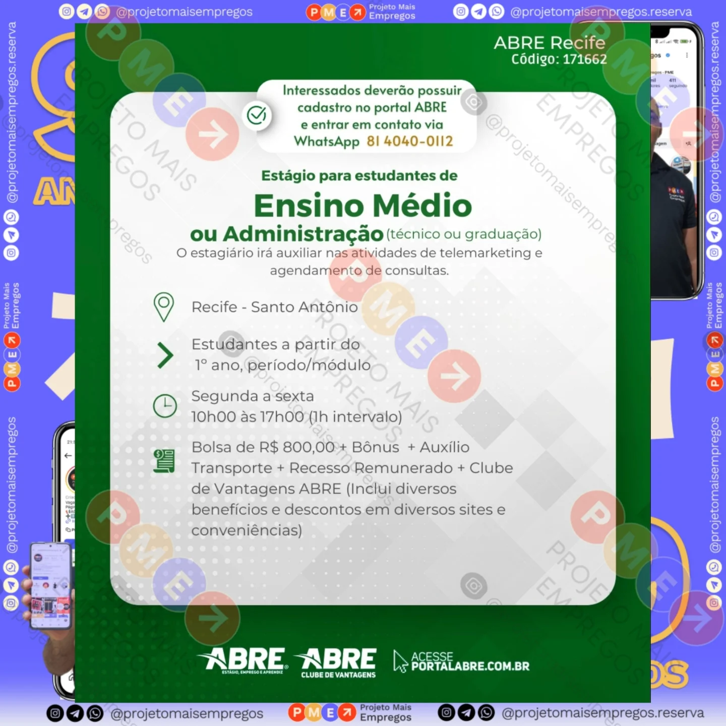 Quantidade de vagas: ESTAGIÁRIO(A): 17; ATENDENTE: 2