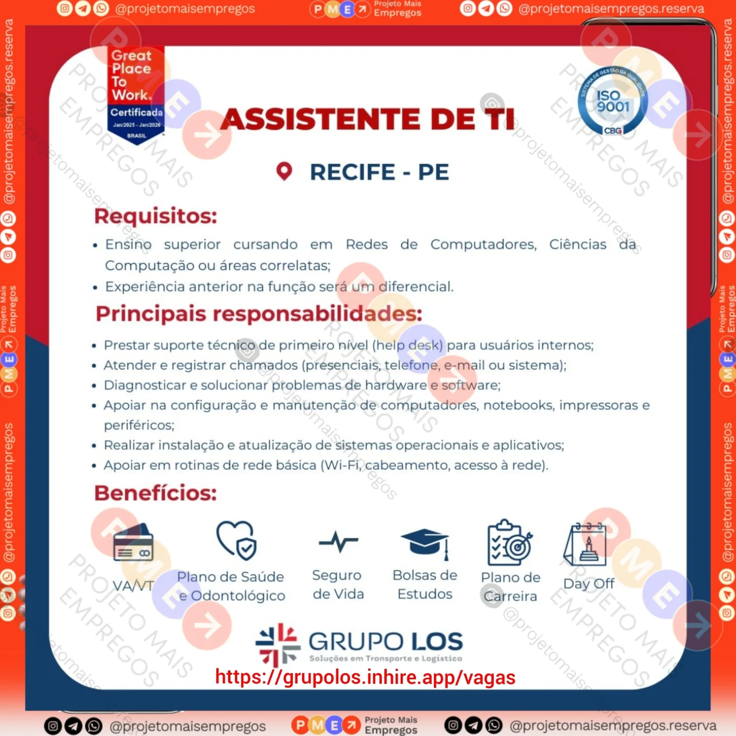 Benefícios: AUXILIAR / ASSISTENTE DE RH (RECURSOS HUMANOS): day off de aniversário, plano de carreira, plano de saúde, plano odontológico, seguro de vida, vale-alimentação, vale-transporte; SUPERVISOR(A): plano de saúde, plano odontológico, seguro de vida