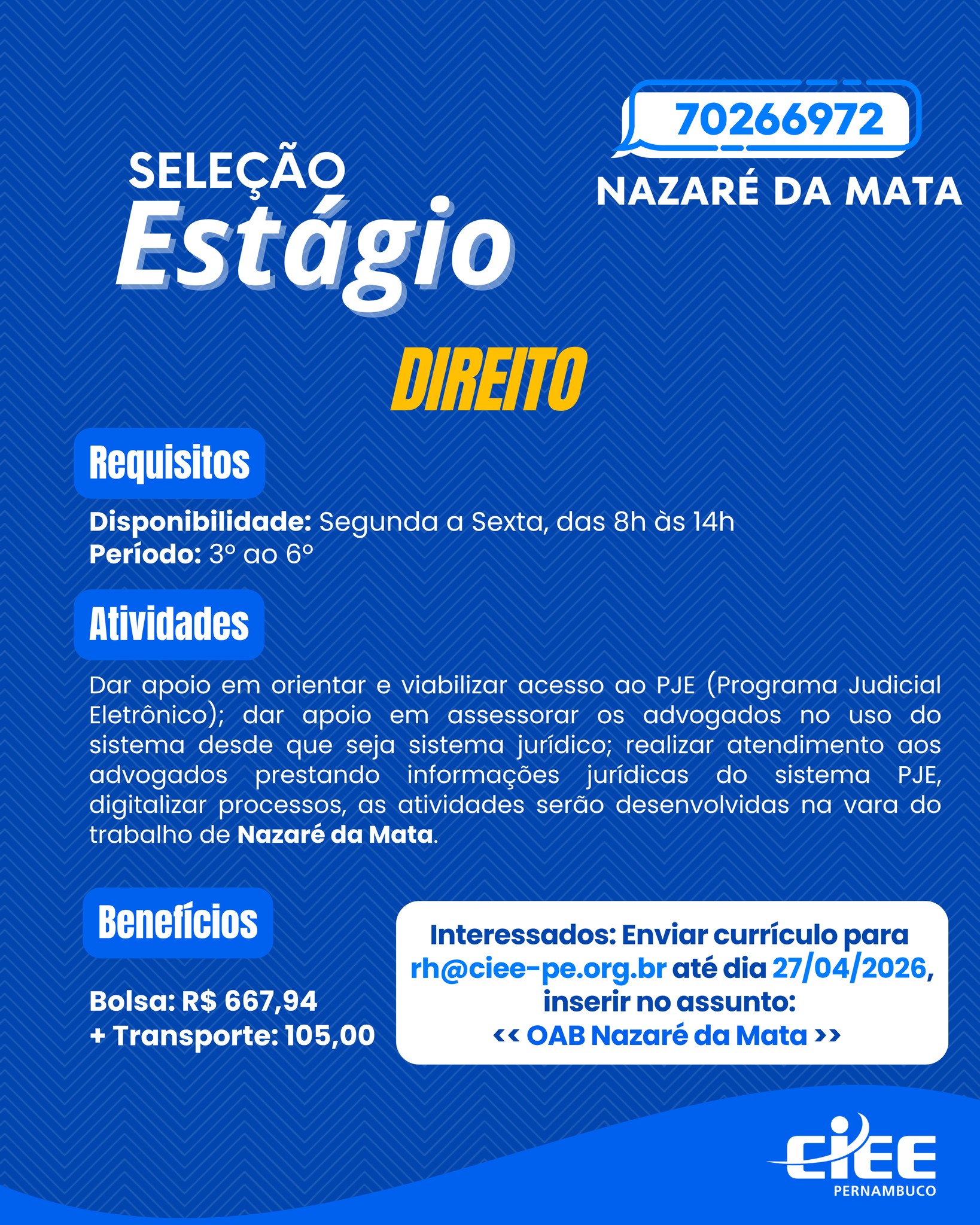 Quantidade de vagas: ESTAGIÁRIO(A): 2