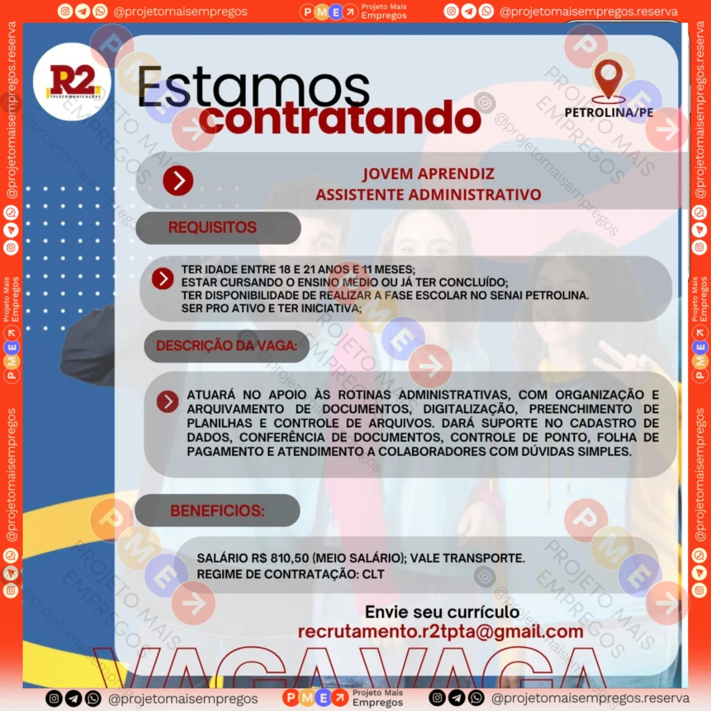 Benefícios: JOVEM APRENDIZ: diversos benefícios; AUXILIAR / ASSISTENTE ADMINISTRATIVO: vale-alimentação, vale-transporte