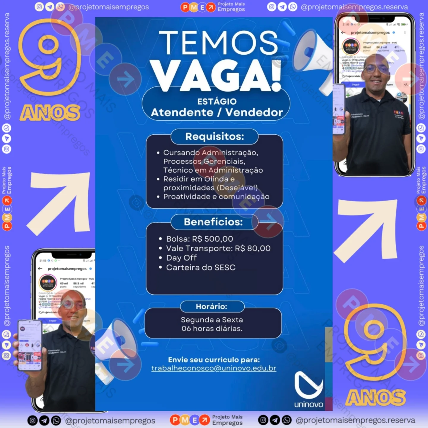 As informações sobre a vaga de emprego, como salário, remuneração, benefícios, requisitos, local de trabalho, forma de candidatura (e-mail ou whatsapp para enviar seu currículo) etc., estarão na imagem abaixo, caso estejam disponíveis.👇