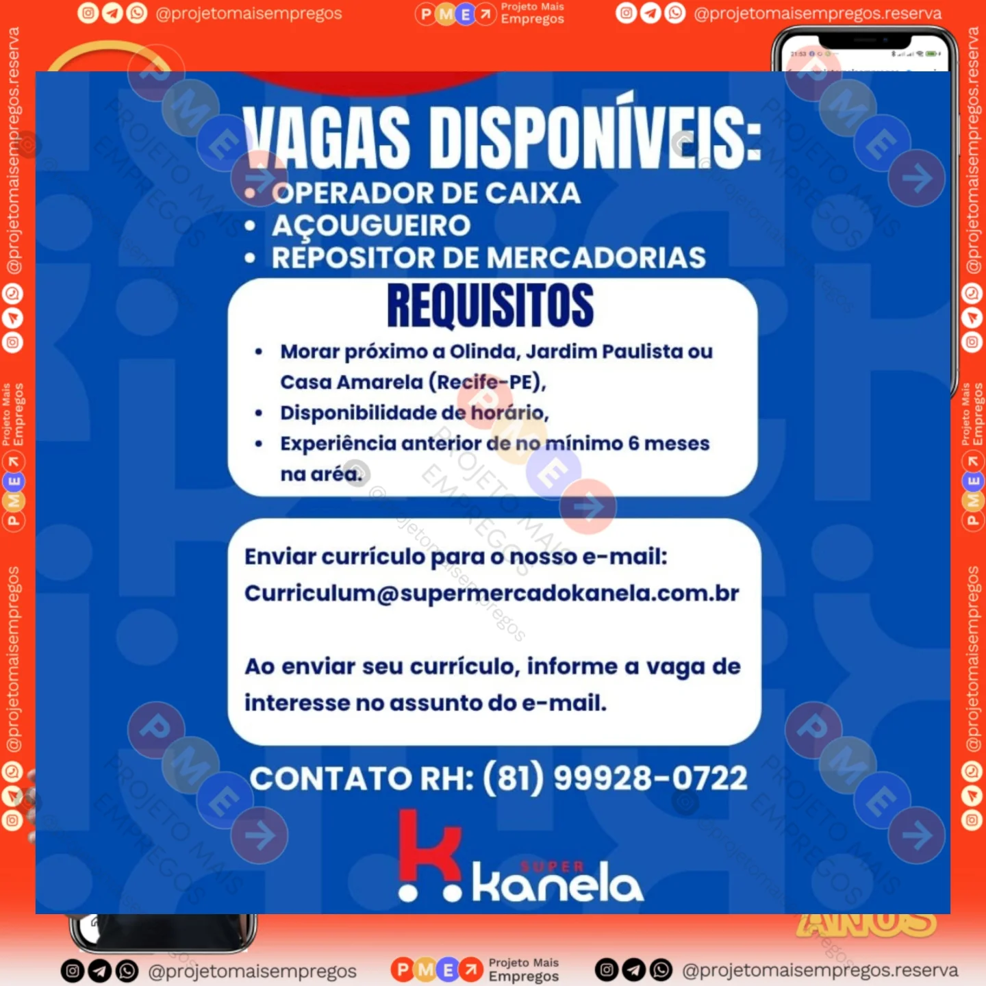 3 Vagas de emprego para Operador(a) de Caixa / Caixa de Loja, Açougueiro(a), Repositor(a) em Supermercado Kanela nesta segunda-feira (13/04)
