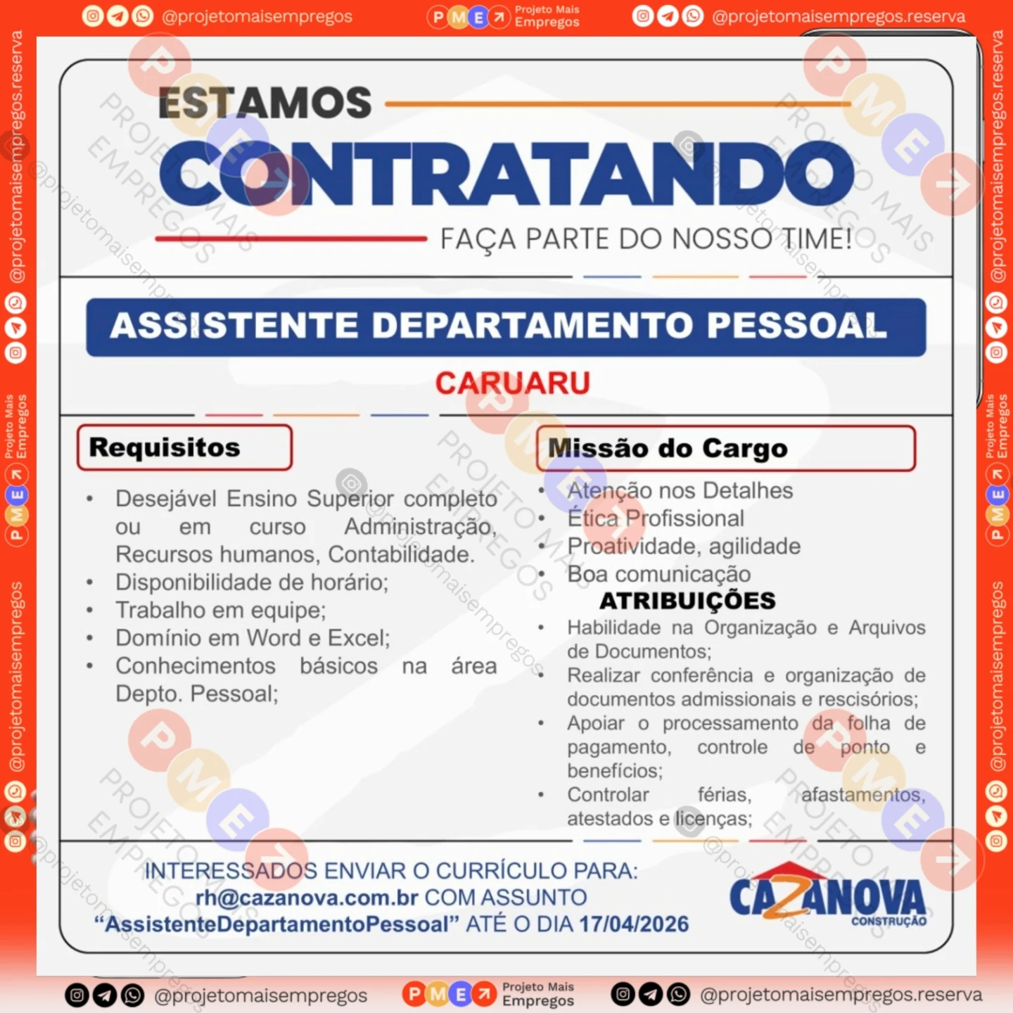 5 Vagas de emprego para Auxiliar / Assistente de Rh (recursos humanos), Analista de Rh (recursos humanos), Supervisor(a), Vendedor(a) em Pernambuco nesta quinta-feira (16/04)