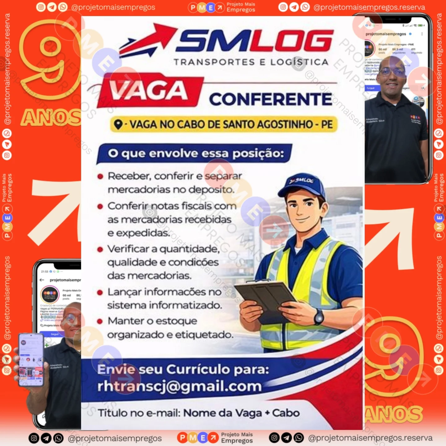 Benefícios: AUXILIAR DE LOGÍSTICA: day off de aniversário, plano de saúde, plano odontológico, vale-transporte; TÉCNICO(A) DE SEGURANCA DO TRABALHO: diversos benefícios; AJUDANTE DE CARGA E DESCARGA: diversos benefícios; CONFERENTE: diversos benefícios